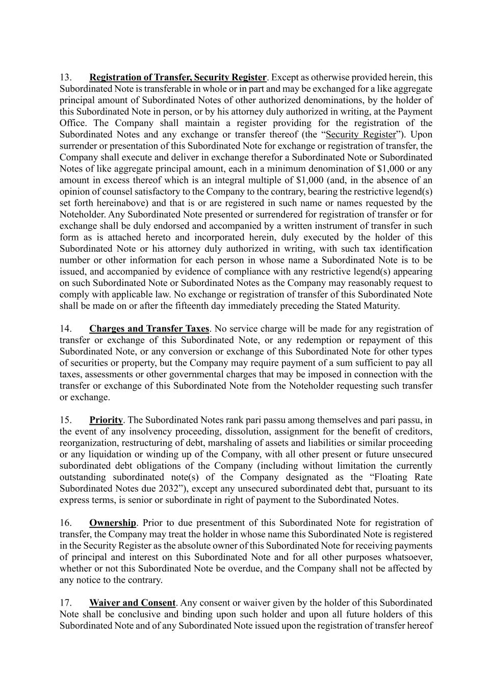 13. Registration of Transfer, Security Register. Except as otherwise provided herein, this Subordinated Note is transferable in whole or in part and may be exchanged for a like aggregate principal amount of Subordinated Notes of other authorized denominations, by the holder of this Subordinated Note in person, or by his attorney duly authorized in writing, at the Payment Office. The Company shall maintain a register providing for the registration of the Subordinated Notes and any exchange or transfer thereof (the “Security Register”). Upon surrender or presentation of this Subordinated Note for exchange or registration of transfer, the Company shall execute and deliver in exchange therefor a Subordinated Note or Subordinated Notes of like aggregate principal amount, each in a minimum denomination of $1,000 or any amount in excess thereof which is an integral multiple of $1,000 (and, in the absence of an opinion of counsel satisfactory to the Company to the contrary, bearing the restrictive legend(s) set forth hereinabove) and that is or are registered in such name or names requested by the Noteholder. Any Subordinated Note presented or surrendered for registration of transfer or for exchange shall be duly endorsed and accompanied by a written instrument of transfer in such form as is attached hereto and incorporated herein, duly executed by the holder of this Subordinated Note or his attorney duly authorized in writing, with such tax identification number or other information for each person in whose name a Subordinated Note is to be issued, and accompanied by evidence of compliance with any restrictive legend(s) appearing on such Subordinated Note or Subordinated Notes as the Company may reasonably request to comply with applicable law. No exchange or registration of transfer of this Subordinated Note shall be made on or after the fifteenth day immediately preceding the Stated Maturity. 14. Charges and Transfer Taxes. No service charge will be made for any registration of transfer or exchange of this Subordinated Note, or any redemption or repayment of this Subordinated Note, or any conversion or exchange of this Subordinated Note for other types of securities or property, but the Company may require payment of a sum sufficient to pay all taxes, assessments or other governmental charges that may be imposed in connection with the transfer or exchange of this Subordinated Note from the Noteholder requesting such transfer or exchange. 15. Priority. The Subordinated Notes rank pari passu among themselves and pari passu, in the event of any insolvency proceeding, dissolution, assignment for the benefit of creditors, reorganization, restructuring of debt, marshaling of assets and liabilities or similar proceeding or any liquidation or winding up of the Company, with all other present or future unsecured subordinated debt obligations of the Company (including without limitation the currently outstanding subordinated note(s) of the Company designated as the “Floating Rate Subordinated Notes due 2032”), except any unsecured subordinated debt that, pursuant to its express terms, is senior or subordinate in right of payment to the Subordinated Notes. 16. Ownership. Prior to due presentment of this Subordinated Note for registration of transfer, the Company may treat the holder in whose name this Subordinated Note is registered in the Security Register as the absolute owner of this Subordinated Note for receiving payments of principal and interest on this Subordinated Note and for all other purposes whatsoever, whether or not this Subordinated Note be overdue, and the Company shall not be affected by any notice to the contrary. 17. Waiver and Consent. Any consent or waiver given by the holder of this Subordinated Note shall be conclusive and binding upon such holder and upon all future holders of this Subordinated Note and of any Subordinated Note issued upon the registration of transfer hereof