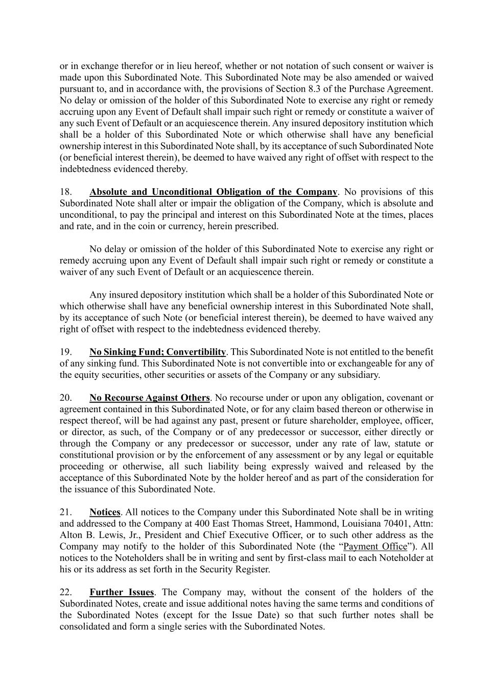 or in exchange therefor or in lieu hereof, whether or not notation of such consent or waiver is made upon this Subordinated Note. This Subordinated Note may be also amended or waived pursuant to, and in accordance with, the provisions of Section 8.3 of the Purchase Agreement. No delay or omission of the holder of this Subordinated Note to exercise any right or remedy accruing upon any Event of Default shall impair such right or remedy or constitute a waiver of any such Event of Default or an acquiescence therein. Any insured depository institution which shall be a holder of this Subordinated Note or which otherwise shall have any beneficial ownership interest in this Subordinated Note shall, by its acceptance of such Subordinated Note (or beneficial interest therein), be deemed to have waived any right of offset with respect to the indebtedness evidenced thereby. 18. Absolute and Unconditional Obligation of the Company. No provisions of this Subordinated Note shall alter or impair the obligation of the Company, which is absolute and unconditional, to pay the principal and interest on this Subordinated Note at the times, places and rate, and in the coin or currency, herein prescribed. No delay or omission of the holder of this Subordinated Note to exercise any right or remedy accruing upon any Event of Default shall impair such right or remedy or constitute a waiver of any such Event of Default or an acquiescence therein. Any insured depository institution which shall be a holder of this Subordinated Note or which otherwise shall have any beneficial ownership interest in this Subordinated Note shall, by its acceptance of such Note (or beneficial interest therein), be deemed to have waived any right of offset with respect to the indebtedness evidenced thereby. 19. No Sinking Fund; Convertibility. This Subordinated Note is not entitled to the benefit of any sinking fund. This Subordinated Note is not convertible into or exchangeable for any of the equity securities, other securities or assets of the Company or any subsidiary. 20. No Recourse Against Others. No recourse under or upon any obligation, covenant or agreement contained in this Subordinated Note, or for any claim based thereon or otherwise in respect thereof, will be had against any past, present or future shareholder, employee, officer, or director, as such, of the Company or of any predecessor or successor, either directly or through the Company or any predecessor or successor, under any rate of law, statute or constitutional provision or by the enforcement of any assessment or by any legal or equitable proceeding or otherwise, all such liability being expressly waived and released by the acceptance of this Subordinated Note by the holder hereof and as part of the consideration for the issuance of this Subordinated Note. 21. Notices. All notices to the Company under this Subordinated Note shall be in writing and addressed to the Company at 400 East Thomas Street, Hammond, Louisiana 70401, Attn: Alton B. Lewis, Jr., President and Chief Executive Officer, or to such other address as the Company may notify to the holder of this Subordinated Note (the “Payment Office”). All notices to the Noteholders shall be in writing and sent by first-class mail to each Noteholder at his or its address as set forth in the Security Register. 22. Further Issues. The Company may, without the consent of the holders of the Subordinated Notes, create and issue additional notes having the same terms and conditions of the Subordinated Notes (except for the Issue Date) so that such further notes shall be consolidated and form a single series with the Subordinated Notes.
