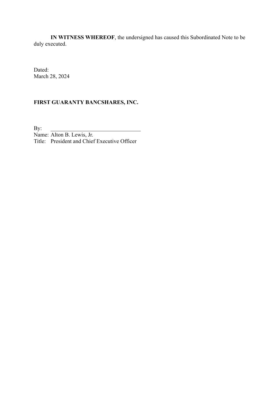 IN WITNESS WHEREOF, the undersigned has caused this Subordinated Note to be duly executed. Dated: March 28, 2024 FIRST GUARANTY BANCSHARES, INC. By: ________________________________ Name: Alton B. Lewis, Jr. Title: President and Chief Executive Officer