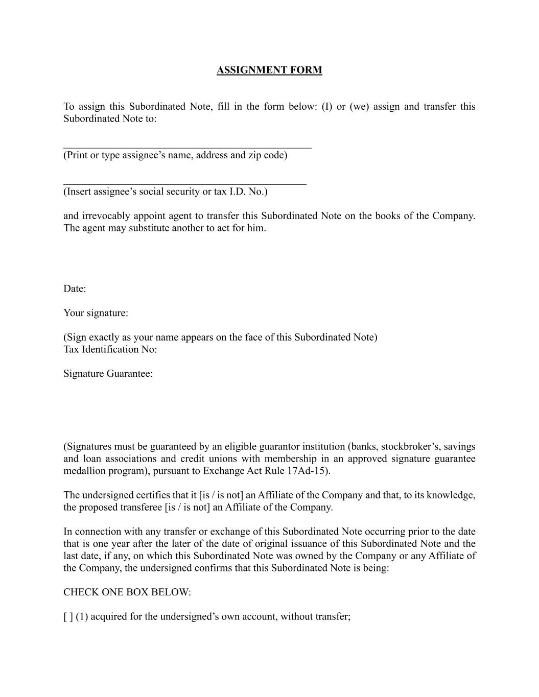 ASSIGNMENT FORM To assign this Subordinated Note, fill in the form below: (I) or (we) assign and transfer this Subordinated Note to: _______________________________________________ (Print or type assignee’s name, address and zip code) ______________________________________________ (Insert assignee’s social security or tax I.D. No.) and irrevocably appoint agent to transfer this Subordinated Note on the books of the Company. The agent may substitute another to act for him. Date: Your signature: (Sign exactly as your name appears on the face of this Subordinated Note) Tax Identification No: Signature Guarantee: (Signatures must be guaranteed by an eligible guarantor institution (banks, stockbroker’s, savings and loan associations and credit unions with membership in an approved signature guarantee medallion program), pursuant to Exchange Act Rule 17Ad-15). The undersigned certifies that it [is / is not] an Affiliate of the Company and that, to its knowledge, the proposed transferee [is / is not] an Affiliate of the Company. In connection with any transfer or exchange of this Subordinated Note occurring prior to the date that is one year after the later of the date of original issuance of this Subordinated Note and the last date, if any, on which this Subordinated Note was owned by the Company or any Affiliate of the Company, the undersigned confirms that this Subordinated Note is being: CHECK ONE BOX BELOW: [ ] (1) acquired for the undersigned’s own account, without transfer;