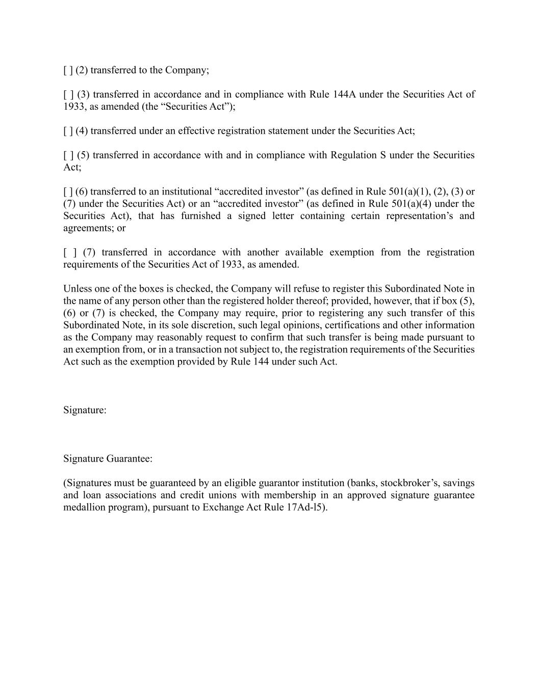 [ ] (2) transferred to the Company; [ ] (3) transferred in accordance and in compliance with Rule 144A under the Securities Act of 1933, as amended (the “Securities Act”); [ ] (4) transferred under an effective registration statement under the Securities Act; [ ] (5) transferred in accordance with and in compliance with Regulation S under the Securities Act; [ ] (6) transferred to an institutional “accredited investor” (as defined in Rule 501(a)(1), (2), (3) or (7) under the Securities Act) or an “accredited investor” (as defined in Rule 501(a)(4) under the Securities Act), that has furnished a signed letter containing certain representation’s and agreements; or [ ] (7) transferred in accordance with another available exemption from the registration requirements of the Securities Act of 1933, as amended. Unless one of the boxes is checked, the Company will refuse to register this Subordinated Note in the name of any person other than the registered holder thereof; provided, however, that if box (5), (6) or (7) is checked, the Company may require, prior to registering any such transfer of this Subordinated Note, in its sole discretion, such legal opinions, certifications and other information as the Company may reasonably request to confirm that such transfer is being made pursuant to an exemption from, or in a transaction not subject to, the registration requirements of the Securities Act such as the exemption provided by Rule 144 under such Act. Signature: Signature Guarantee: (Signatures must be guaranteed by an eligible guarantor institution (banks, stockbroker’s, savings and loan associations and credit unions with membership in an approved signature guarantee medallion program), pursuant to Exchange Act Rule 17Ad-l5).