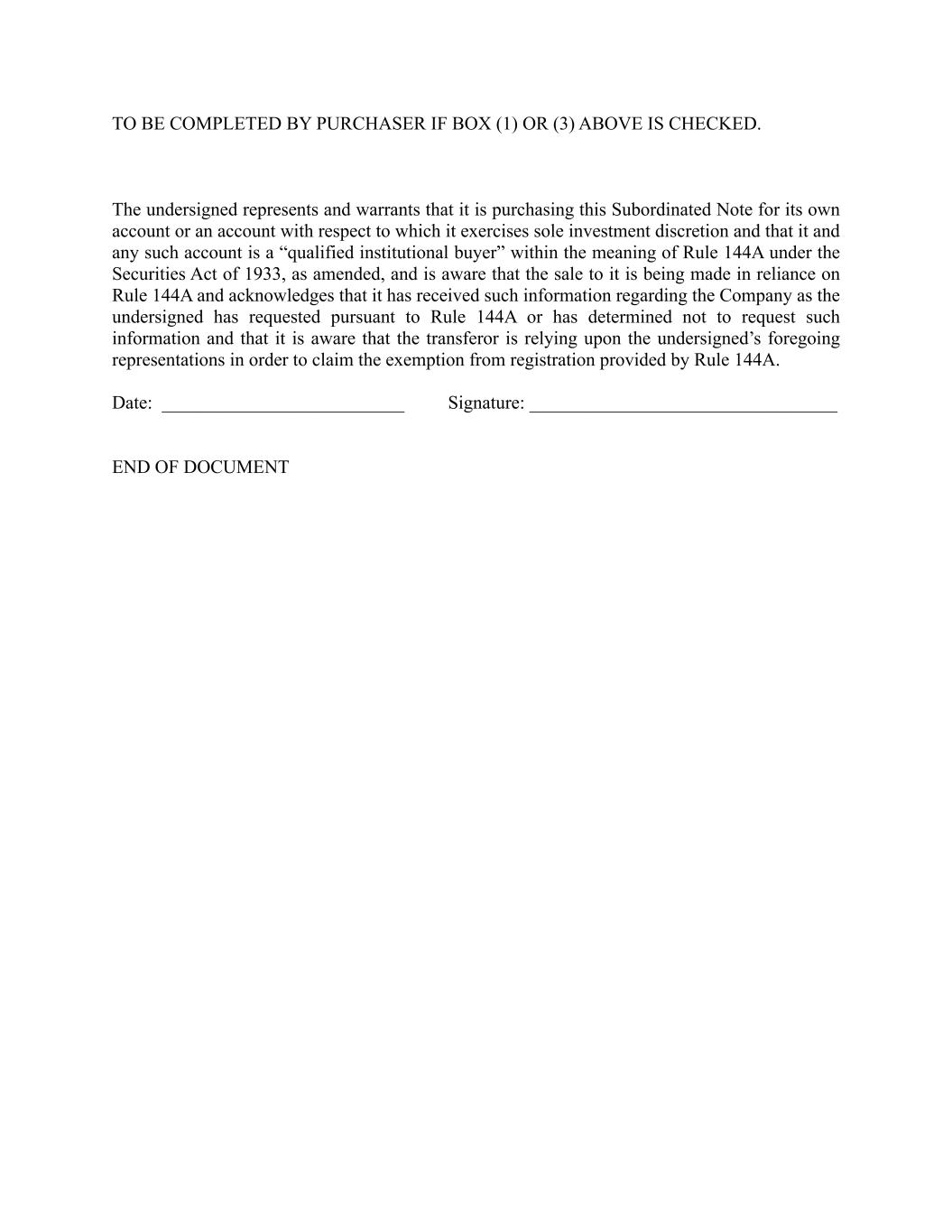 TO BE COMPLETED BY PURCHASER IF BOX (1) OR (3) ABOVE IS CHECKED. The undersigned represents and warrants that it is purchasing this Subordinated Note for its own account or an account with respect to which it exercises sole investment discretion and that it and any such account is a “qualified institutional buyer” within the meaning of Rule 144A under the Securities Act of 1933, as amended, and is aware that the sale to it is being made in reliance on Rule 144A and acknowledges that it has received such information regarding the Company as the undersigned has requested pursuant to Rule 144A or has determined not to request such information and that it is aware that the transferor is relying upon the undersigned’s foregoing representations in order to claim the exemption from registration provided by Rule 144A. Date: __________________________ Signature: _________________________________ END OF DOCUMENT