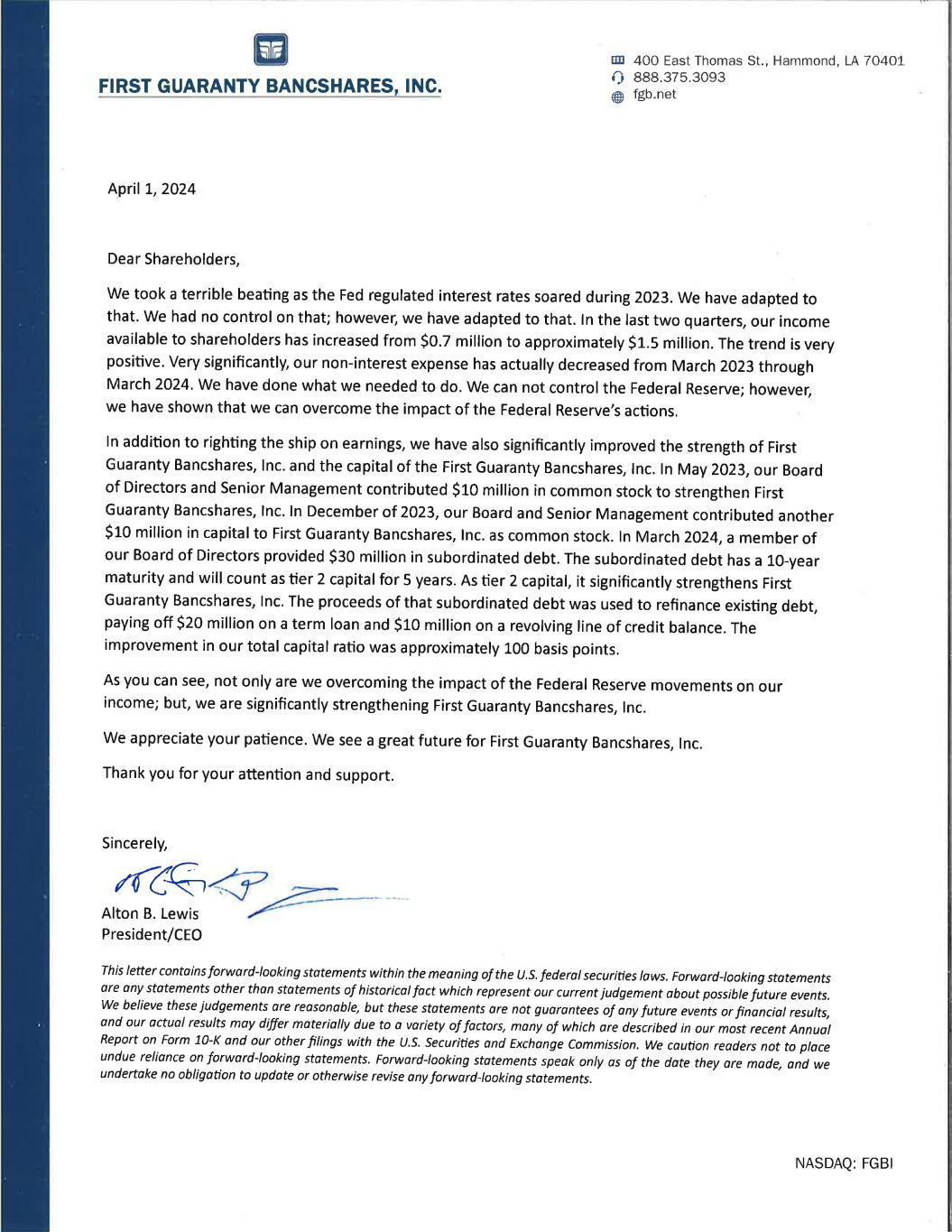 EX-99.1 2 fgbi-ex9911qdividendlett.htm EX-99.1 fgbi-ex9911qdividendlett