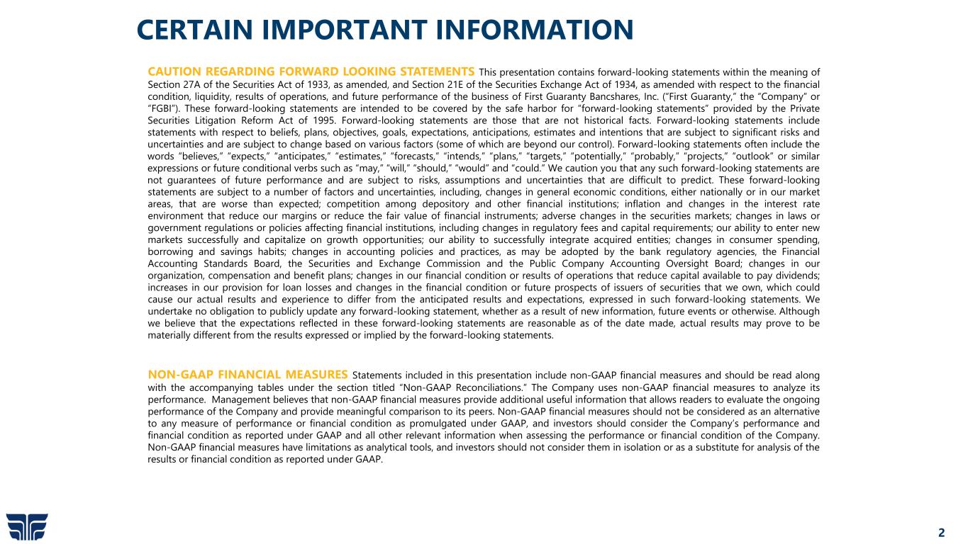 2 CERTAIN IMPORTANT INFORMATION CAUTION REGARDING FORWARD LOOKING STATEMENTS This presentation contains forward-looking statements within the meaning of Section 27A of the Securities Act of 1933, as amended, and Section 21E of the Securities Exchange Act of 1934, as amended with respect to the financial condition, liquidity, results of operations, and future performance of the business of First Guaranty Bancshares, Inc. (“First Guaranty,” the “Company” or “FGBI”). These forward-looking statements are intended to be covered by the safe harbor for “forward-looking statements” provided by the Private Securities Litigation Reform Act of 1995. Forward-looking statements are those that are not historical facts. Forward-looking statements include statements with respect to beliefs, plans, objectives, goals, expectations, anticipations, estimates and intentions that are subject to significant risks and uncertainties and are subject to change based on various factors (some of which are beyond our control). Forward-looking statements often include the words “believes,” “expects,” “anticipates,” “estimates,” “forecasts,” “intends,” “plans,” “targets,” “potentially,” “probably,” “projects,” “outlook” or similar expressions or future conditional verbs such as “may,” “will,” “should,” “would” and “could.” We caution you that any such forward-looking statements are not guarantees of future performance and are subject to risks, assumptions and uncertainties that are difficult to predict. These forward-looking statements are subject to a number of factors and uncertainties, including, changes in general economic conditions, either nationally or in our market areas, that are worse than expected; competition among depository and other financial institutions; inflation and changes in the interest rate environment that reduce our margins or reduce the fair value of financial instruments; adverse changes in the securities markets; changes in laws or government regulations or policies affecting financial institutions, including changes in regulatory fees and capital requirements; our ability to enter new markets successfully and capitalize on growth opportunities; our ability to successfully integrate acquired entities; changes in consumer spending, borrowing and savings habits; changes in accounting policies and practices, as may be adopted by the bank regulatory agencies, the Financial Accounting Standards Board, the Securities and Exchange Commission and the Public Company Accounting Oversight Board; changes in our organization, compensation and benefit plans; changes in our financial condition or results of operations that reduce capital available to pay dividends; increases in our provision for loan losses and changes in the financial condition or future prospects of issuers of securities that we own, which could cause our actual results and experience to differ from the anticipated results and expectations, expressed in such forward-looking statements. We undertake no obligation to publicly update any forward-looking statement, whether as a result of new information, future events or otherwise. Although we believe that the expectations reflected in these forward-looking statements are reasonable as of the date made, actual results may prove to be materially different from the results expressed or implied by the forward-looking statements. NON-GAAP FINANCIAL MEASURES Statements included in this presentation include non-GAAP financial measures and should be read along with the accompanying tables under the section titled “Non-GAAP Reconciliations.” The Company uses non-GAAP financial measures to analyze its performance. Management believes that non-GAAP financial measures provide additional useful information that allows readers to evaluate the ongoing performance of the Company and provide meaningful comparison to its peers. Non-GAAP financial measures should not be considered as an alternative to any measure of performance or financial condition as promulgated under GAAP, and investors should consider the Company’s performance and financial condition as reported under GAAP and all other relevant information when assessing the performance or financial condition of the Company. Non-GAAP financial measures have limitations as analytical tools, and investors should not consider them in isolation or as a substitute for analysis of the results or financial condition as reported under GAAP.