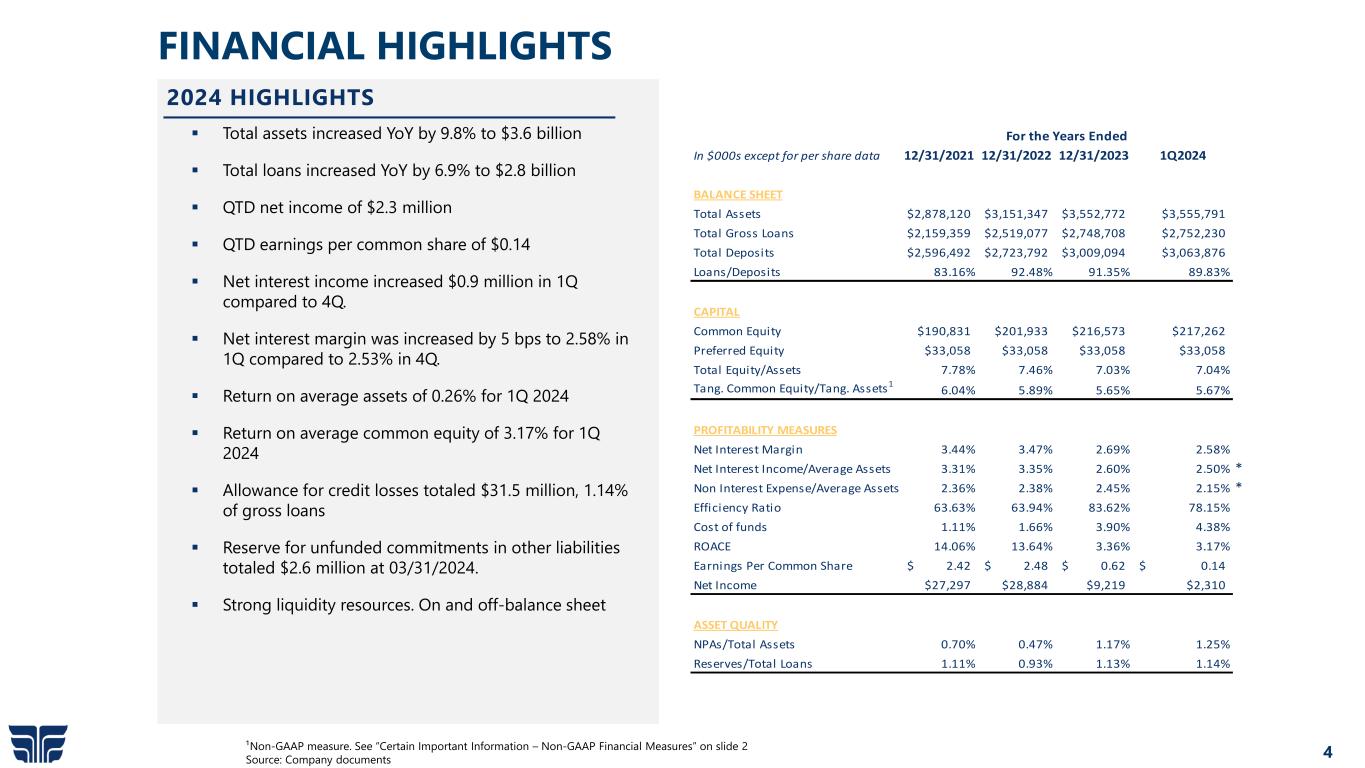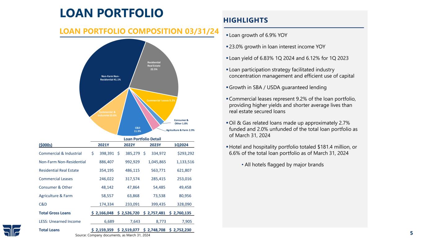 4 FINANCIAL HIGHLIGHTS  Total assets increased YoY by 9.8% to $3.6 billion  Total loans increased YoY by 6.9% to $2.8 billion  QTD net income of $2.3 million  QTD earnings per common share of $0.14  Net interest income increased $0.9 million in 1Q compared to 4Q.  Net interest margin was increased by 5 bps to 2.58% in 1Q compared to 2.53% in 4Q.  Return on average assets of 0.26% for 1Q 2024  Return on average common equity of 3.17% for 1Q 2024  Allowance for credit losses totaled $31.5 million, 1.14% of gross loans  Reserve for unfunded commitments in other liabilities totaled $2.6 million at 03/31/2024.  Strong liquidity resources. On and off-balance sheet 2024 HIGHLIGHTS ¹Non-GAAP measure. See “Certain Important Information – Non-GAAP Financial Measures” on slide 2 Source: Company documents In $000s except for per share data 12/31/2021 12/31/2022 12/31/2023 1Q2024 BALANCE SHEET Total Assets $2,878,120 $3,151,347 $3,552,772 $3,555,791 Total Gross Loans $2,159,359 $2,519,077 $2,748,708 $2,752,230 Total Deposits $2,596,492 $2,723,792 $3,009,094 $3,063,876 Loans/Deposits 83.16% 92.48% 91.35% 89.83% CAPITAL Common Equity $190,831 $201,933 $216,573 $217,262 Preferred Equity $33,058 $33,058 $33,058 $33,058 Total Equity/Assets 7.78% 7.46% 7.03% 7.04% Tang. Common Equity/Tang. Assets1 6.04% 5.89% 5.65% 5.67% PROFITABILITY MEASURES Net Interest Margin 3.44% 3.47% 2.69% 2.58% Net Interest Income/Average Assets 3.31% 3.35% 2.60% 2.50% * Non Interest Expense/Average Assets 2.36% 2.38% 2.45% 2.15% * Efficiency Ratio 63.63% 63.94% 83.62% 78.15% Cost of funds 1.11% 1.66% 3.90% 4.38% ROACE 14.06% 13.64% 3.36% 3.17% Earnings Per Common Share 2.42$ 2.48$ 0.62$ 0.14$ Net Income $27,297 $28,884 $9,219 $2,310 ASSET QUALITY NPAs/Total Assets 0.70% 0.47% 1.17% 1.25% Reserves/Total Loans 1.11% 0.93% 1.13% 1.14% For the Years Ended