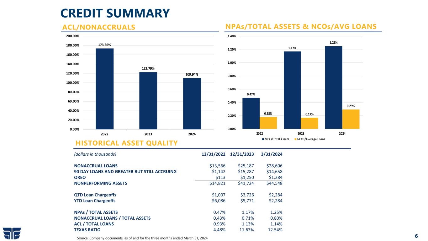 5 LOAN PORTFOLIO Source: Company documents, as March 31, 2024  Loan growth of 6.9% YOY 23.0% growth in loan interest income YOY  Loan yield of 6.83% 1Q 2024 and 6.12% for 1Q 2023  Loan participation strategy facilitated industry concentration management and efficient use of capital Growth in SBA / USDA guaranteed lending Commercial leases represent 9.2% of the loan portfolio, providing higher yields and shorter average lives than real estate secured loans Oil & Gas related loans made up approximately 2.7% funded and 2.0% unfunded of the total loan portfolio as of March 31, 2024 Hotel and hospitality portfolio totaled $181.4 million, or 6.6% of the total loan portfolio as of March 31, 2024 • All hotels flagged by major brands HIGHLIGHTS Commercial & Industrial10.6% Non-Farm Non- Residential 41.1% Residential Real Estate 22.5% Commercial Leases 9.2% Consumer & Other 1.8% Agriculture & Farm 2.9% C&D 11.9% LOAN PORTFOLIO COMPOSITION 03/31/24 Loan Portfolio Detail ($000s) 2021Y 2022Y 2023Y 1Q2024 Commercial & Industrial $ 398,391 $ 385,279 $ 334,972 $293,292 Non-Farm Non-Residential 886,407 992,929 1,045,865 1,133,516 Residential Real Estate 354,195 486,115 563,771 621,807 Commercial Leases 246,022 317,574 285,415 253,016 Consumer & Other 48,142 47,864 54,485 49,458 Agriculture & Farm 58,557 63,868 73,538 80,956 C&D 174,334 233,091 399,435 328,090 Total Gross Loans $ 2,166,048 $ 2,526,720 $ 2,757,481 $ 2,760,135 LESS: Unearned Income 6,689 7,643 8,773 7,905 Total Loans $ 2,159,359 $ 2,519,077 $ 2,748,708 $ 2,752,230