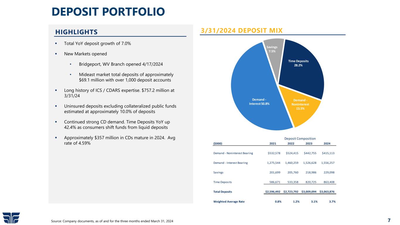 6 173.36% 122.79% 109.94% 0.00% 20.00% 40.00% 60.00% 80.00% 100.00% 120.00% 140.00% 160.00% 180.00% 200.00% 2022 2023 2024 CREDIT SUMMARY Source: Company documents, as of and for the three months ended March 31, 2024 ACL/NONACCRUALS HISTORICAL ASSET QUALITY 0.47% 1.17% 1.25% 0.18% 0.17% 0.29% 0.00% 0.20% 0.40% 0.60% 0.80% 1.00% 1.20% 1.40% 2022 2023 2024 NPAs/Total Assets NCOs/Average Loans NPAs/TOTAL ASSETS & NCOs/AVG LOANS (dollars in thousands) 12/31/2022 12/31/2023 3/31/2024 NONACCRUAL LOANS $13,566 $25,187 $28,606 90 DAY LOANS AND GREATER BUT STILL ACCRUING $1,142 $15,287 $14,658 OREO $113 $1,250 $1,284 NONPERFORMING ASSETS $14,821 $41,724 $44,548 QTD Loan Chargeoffs $1,007 $3,726 $2,284 YTD Loan Chargeoffs $6,086 $5,771 $2,284 NPAs / TOTAL ASSETS 0.47% 1.17% 1.25% NONACCRUAL LOANS / TOTAL ASSETS 0.43% 0.71% 0.80% ACL / TOTAL LOANS 0.93% 1.13% 1.14% TEXAS RATIO 4.48% 11.63% 12.54%