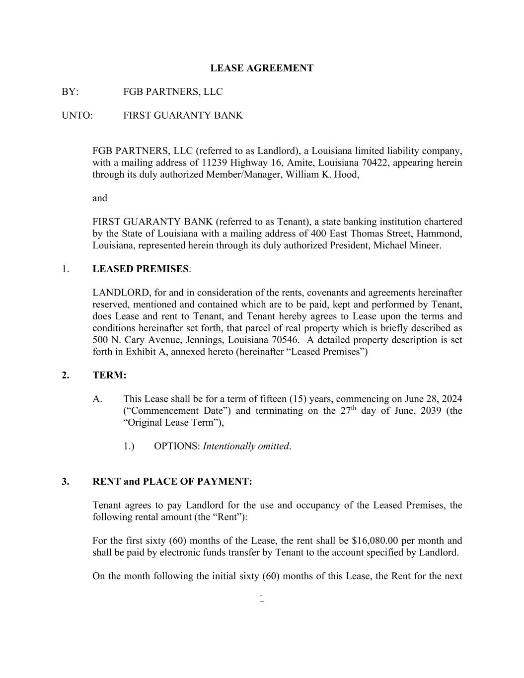 1 LEASE AGREEMENT BY: FGB PARTNERS, LLC UNTO: FIRST GUARANTY BANK FGB PARTNERS, LLC (referred to as Landlord), a Louisiana limited liability company, with a mailing address of 11239 Highway 16, Amite, Louisiana 70422, appearing herein through its duly authorized Member/Manager, William K. Hood, and FIRST GUARANTY BANK (referred to as Tenant), a state banking institution chartered by the State of Louisiana with a mailing address of 400 East Thomas Street, Hammond, Louisiana, represented herein through its duly authorized President, Michael Mineer. 1. LEASED PREMISES: LANDLORD, for and in consideration of the rents, covenants and agreements hereinafter reserved, mentioned and contained which are to be paid, kept and performed by Tenant, does Lease and rent to Tenant, and Tenant hereby agrees to Lease upon the terms and conditions hereinafter set forth, that parcel of real property which is briefly described as 500 N. Cary Avenue, Jennings, Louisiana 70546. A detailed property description is set forth in Exhibit A, annexed hereto (hereinafter “Leased Premises”) 2. TERM: A. This Lease shall be for a term of fifteen (15) years, commencing on June 28, 2024 (“Commencement Date”) and terminating on the 27th day of June, 2039 (the “Original Lease Term”), 1.) OPTIONS: Intentionally omitted. 3. RENT and PLACE OF PAYMENT: Tenant agrees to pay Landlord for the use and occupancy of the Leased Premises, the following rental amount (the “Rent”): For the first sixty (60) months of the Lease, the rent shall be $16,080.00 per month and shall be paid by electronic funds transfer by Tenant to the account specified by Landlord. On the month following the initial sixty (60) months of this Lease, the Rent for the next