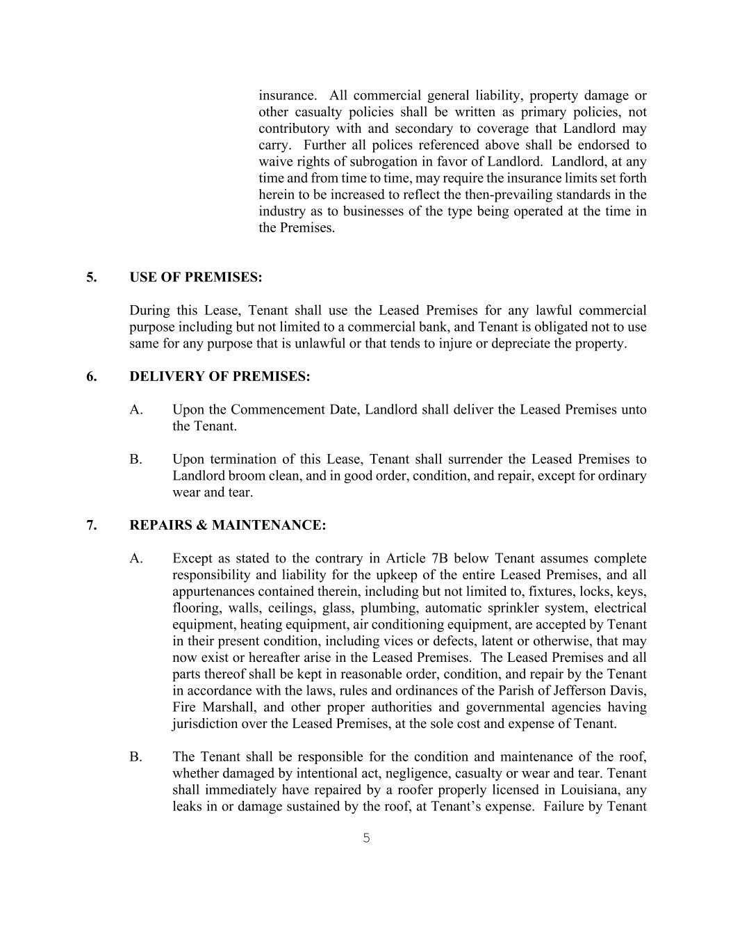 5 insurance. All commercial general liability, property damage or other casualty policies shall be written as primary policies, not contributory with and secondary to coverage that Landlord may carry. Further all polices referenced above shall be endorsed to waive rights of subrogation in favor of Landlord. Landlord, at any time and from time to time, may require the insurance limits set forth herein to be increased to reflect the then-prevailing standards in the industry as to businesses of the type being operated at the time in the Premises. 5. USE OF PREMISES: During this Lease, Tenant shall use the Leased Premises for any lawful commercial purpose including but not limited to a commercial bank, and Tenant is obligated not to use same for any purpose that is unlawful or that tends to injure or depreciate the property. 6. DELIVERY OF PREMISES: A. Upon the Commencement Date, Landlord shall deliver the Leased Premises unto the Tenant. B. Upon termination of this Lease, Tenant shall surrender the Leased Premises to Landlord broom clean, and in good order, condition, and repair, except for ordinary wear and tear. 7. REPAIRS & MAINTENANCE: A. Except as stated to the contrary in Article 7B below Tenant assumes complete responsibility and liability for the upkeep of the entire Leased Premises, and all appurtenances contained therein, including but not limited to, fixtures, locks, keys, flooring, walls, ceilings, glass, plumbing, automatic sprinkler system, electrical equipment, heating equipment, air conditioning equipment, are accepted by Tenant in their present condition, including vices or defects, latent or otherwise, that may now exist or hereafter arise in the Leased Premises. The Leased Premises and all parts thereof shall be kept in reasonable order, condition, and repair by the Tenant in accordance with the laws, rules and ordinances of the Parish of Jefferson Davis, Fire Marshall, and other proper authorities and governmental agencies having jurisdiction over the Leased Premises, at the sole cost and expense of Tenant. B. The Tenant shall be responsible for the condition and maintenance of the roof, whether damaged by intentional act, negligence, casualty or wear and tear. Tenant shall immediately have repaired by a roofer properly licensed in Louisiana, any leaks in or damage sustained by the roof, at Tenant’s expense. Failure by Tenant