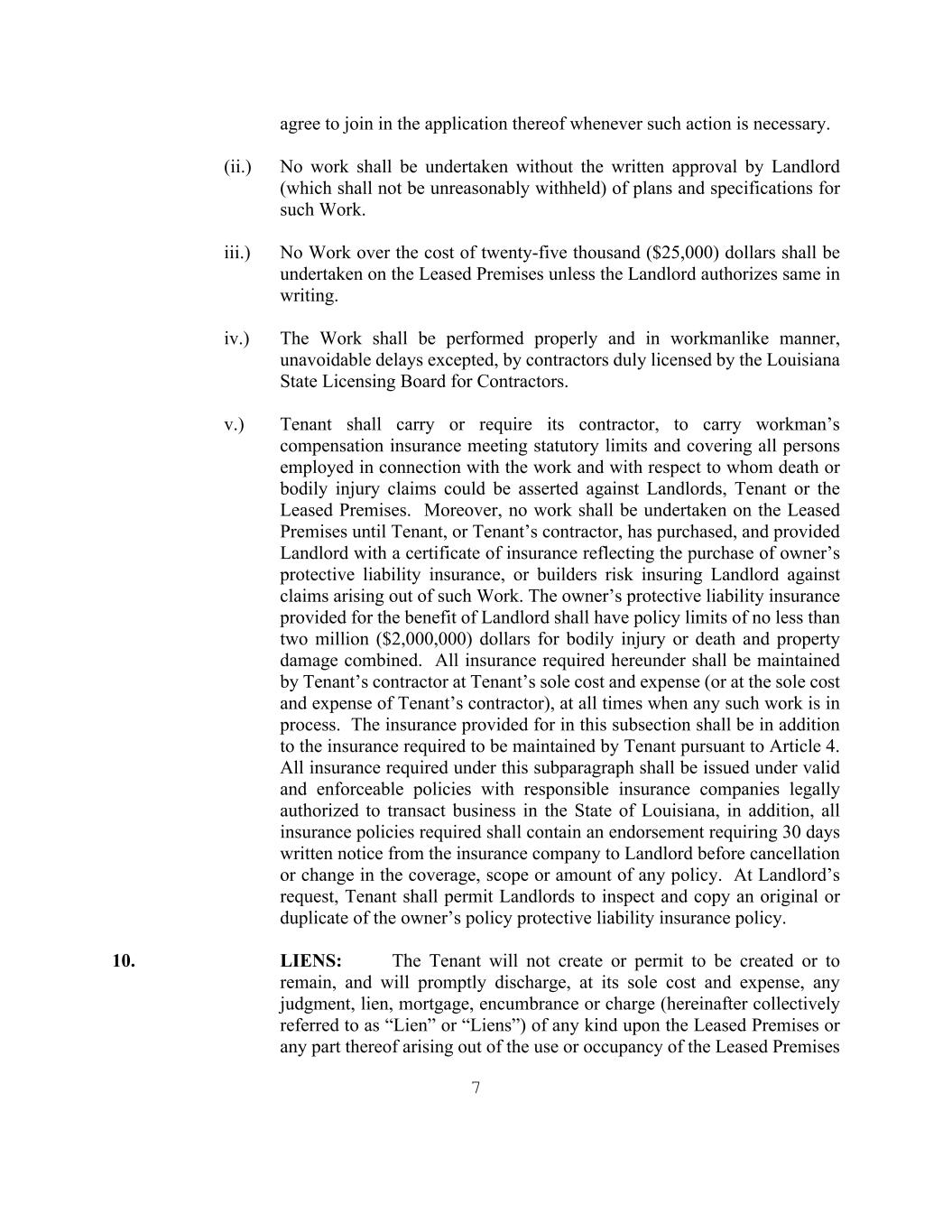 7 agree to join in the application thereof whenever such action is necessary. (ii.) No work shall be undertaken without the written approval by Landlord (which shall not be unreasonably withheld) of plans and specifications for such Work. iii.) No Work over the cost of twenty-five thousand ($25,000) dollars shall be undertaken on the Leased Premises unless the Landlord authorizes same in writing. iv.) The Work shall be performed properly and in workmanlike manner, unavoidable delays excepted, by contractors duly licensed by the Louisiana State Licensing Board for Contractors. v.) Tenant shall carry or require its contractor, to carry workman’s compensation insurance meeting statutory limits and covering all persons employed in connection with the work and with respect to whom death or bodily injury claims could be asserted against Landlords, Tenant or the Leased Premises. Moreover, no work shall be undertaken on the Leased Premises until Tenant, or Tenant’s contractor, has purchased, and provided Landlord with a certificate of insurance reflecting the purchase of owner’s protective liability insurance, or builders risk insuring Landlord against claims arising out of such Work. The owner’s protective liability insurance provided for the benefit of Landlord shall have policy limits of no less than two million ($2,000,000) dollars for bodily injury or death and property damage combined. All insurance required hereunder shall be maintained by Tenant’s contractor at Tenant’s sole cost and expense (or at the sole cost and expense of Tenant’s contractor), at all times when any such work is in process. The insurance provided for in this subsection shall be in addition to the insurance required to be maintained by Tenant pursuant to Article 4. All insurance required under this subparagraph shall be issued under valid and enforceable policies with responsible insurance companies legally authorized to transact business in the State of Louisiana, in addition, all insurance policies required shall contain an endorsement requiring 30 days written notice from the insurance company to Landlord before cancellation or change in the coverage, scope or amount of any policy. At Landlord’s request, Tenant shall permit Landlords to inspect and copy an original or duplicate of the owner’s policy protective liability insurance policy. 10. LIENS: The Tenant will not create or permit to be created or to remain, and will promptly discharge, at its sole cost and expense, any judgment, lien, mortgage, encumbrance or charge (hereinafter collectively referred to as “Lien” or “Liens”) of any kind upon the Leased Premises or any part thereof arising out of the use or occupancy of the Leased Premises
