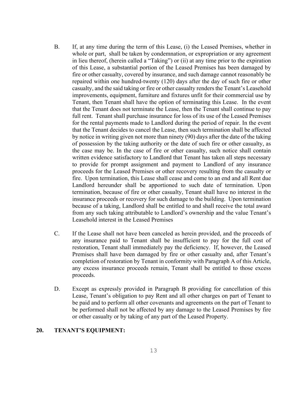 13 B. If, at any time during the term of this Lease, (i) the Leased Premises, whether in whole or part, shall be taken by condemnation, or expropriation or any agreement in lieu thereof, (herein called a “Taking”) or (ii) at any time prior to the expiration of this Lease, a substantial portion of the Leased Premises has been damaged by fire or other casualty, covered by insurance, and such damage cannot reasonably be repaired within one hundred-twenty (120) days after the day of such fire or other casualty, and the said taking or fire or other casualty renders the Tenant’s Leasehold improvements, equipment, furniture and fixtures unfit for their commercial use by Tenant, then Tenant shall have the option of terminating this Lease. In the event that the Tenant does not terminate the Lease, then the Tenant shall continue to pay full rent. Tenant shall purchase insurance for loss of its use of the Leased Premises for the rental payments made to Landlord during the period of repair. In the event that the Tenant decides to cancel the Lease, then such termination shall be affected by notice in writing given not more than ninety (90) days after the date of the taking of possession by the taking authority or the date of such fire or other casualty, as the case may be. In the case of fire or other casualty, such notice shall contain written evidence satisfactory to Landlord that Tenant has taken all steps necessary to provide for prompt assignment and payment to Landlord of any insurance proceeds for the Leased Premises or other recovery resulting from the casualty or fire. Upon termination, this Lease shall cease and come to an end and all Rent due Landlord hereunder shall be apportioned to such date of termination. Upon termination, because of fire or other casualty, Tenant shall have no interest in the insurance proceeds or recovery for such damage to the building. Upon termination because of a taking, Landlord shall be entitled to and shall receive the total award from any such taking attributable to Landlord’s ownership and the value Tenant’s Leasehold interest in the Leased Premises C. If the Lease shall not have been canceled as herein provided, and the proceeds of any insurance paid to Tenant shall be insufficient to pay for the full cost of restoration, Tenant shall immediately pay the deficiency. If, however, the Leased Premises shall have been damaged by fire or other casualty and, after Tenant’s completion of restoration by Tenant in conformity with Paragraph A of this Article, any excess insurance proceeds remain, Tenant shall be entitled to those excess proceeds. D. Except as expressly provided in Paragraph B providing for cancellation of this Lease, Tenant’s obligation to pay Rent and all other charges on part of Tenant to be paid and to perform all other covenants and agreements on the part of Tenant to be performed shall not be affected by any damage to the Leased Premises by fire or other casualty or by taking of any part of the Leased Property. 20. TENANT’S EQUIPMENT: