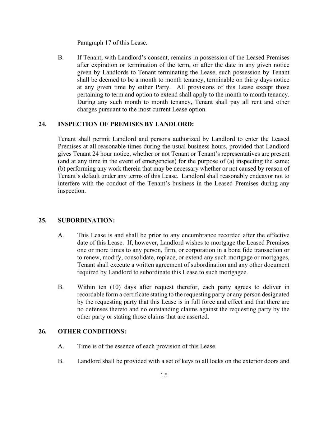 15 Paragraph 17 of this Lease. B. If Tenant, with Landlord’s consent, remains in possession of the Leased Premises after expiration or termination of the term, or after the date in any given notice given by Landlords to Tenant terminating the Lease, such possession by Tenant shall be deemed to be a month to month tenancy, terminable on thirty days notice at any given time by either Party. All provisions of this Lease except those pertaining to term and option to extend shall apply to the month to month tenancy. During any such month to month tenancy, Tenant shall pay all rent and other charges pursuant to the most current Lease option. 24. INSPECTION OF PREMISES BY LANDLORD: Tenant shall permit Landlord and persons authorized by Landlord to enter the Leased Premises at all reasonable times during the usual business hours, provided that Landlord gives Tenant 24 hour notice, whether or not Tenant or Tenant’s representatives are present (and at any time in the event of emergencies) for the purpose of (a) inspecting the same; (b) performing any work therein that may be necessary whether or not caused by reason of Tenant’s default under any terms of this Lease. Landlord shall reasonably endeavor not to interfere with the conduct of the Tenant’s business in the Leased Premises during any inspection. 25. SUBORDINATION: A. This Lease is and shall be prior to any encumbrance recorded after the effective date of this Lease. If, however, Landlord wishes to mortgage the Leased Premises one or more times to any person, firm, or corporation in a bona fide transaction or to renew, modify, consolidate, replace, or extend any such mortgage or mortgages, Tenant shall execute a written agreement of subordination and any other document required by Landlord to subordinate this Lease to such mortgagee. B. Within ten (10) days after request therefor, each party agrees to deliver in recordable form a certificate stating to the requesting party or any person designated by the requesting party that this Lease is in full force and effect and that there are no defenses thereto and no outstanding claims against the requesting party by the other party or stating those claims that are asserted. 26. OTHER CONDITIONS: A. Time is of the essence of each provision of this Lease. B. Landlord shall be provided with a set of keys to all locks on the exterior doors and