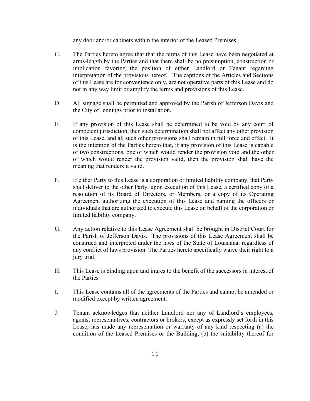 16 any door and/or cabinets within the interior of the Leased Premises. C. The Parties hereto agree that that the terms of this Lease have been negotiated at arms-length by the Parties and that there shall be no presumption, construction or implication favoring the position of either Landlord or Tenant regarding interpretation of the provisions hereof. The captions of the Articles and Sections of this Lease are for convenience only, are not operative parts of this Lease and do not in any way limit or amplify the terms and provisions of this Lease. D. All signage shall be permitted and approved by the Parish of Jefferson Davis and the City of Jennings prior to installation. E. If any provision of this Lease shall be determined to be void by any court of competent jurisdiction, then such determination shall not affect any other provision of this Lease, and all such other provisions shall remain in full force and effect. It is the intention of the Parties hereto that, if any provision of this Lease is capable of two constructions, one of which would render the provision void and the other of which would render the provision valid, then the provision shall have the meaning that renders it valid. F. If either Party to this Lease is a corporation or limited liability company, that Party shall deliver to the other Party, upon execution of this Lease, a certified copy of a resolution of its Board of Directors, or Members, or a copy of its Operating Agreement authorizing the execution of this Lease and naming the officers or individuals that are authorized to execute this Lease on behalf of the corporation or limited liability company. G. Any action relative to this Lease Agreement shall be brought in District Court for the Parish of Jefferson Davis. The provisions of this Lease Agreement shall be construed and interpreted under the laws of the State of Louisiana, regardless of any conflict of laws provision. The Parties hereto specifically waive their right to a jury trial. H. This Lease is binding upon and inures to the benefit of the successors in interest of the Parties I. This Lease contains all of the agreements of the Parties and cannot be amended or modified except by written agreement. J. Tenant acknowledges that neither Landlord nor any of Landlord’s employees, agents, representatives, contractors or brokers, except as expressly set forth in this Lease, has made any representation or warranty of any kind respecting (a) the condition of the Leased Premises or the Building, (b) the suitability thereof for