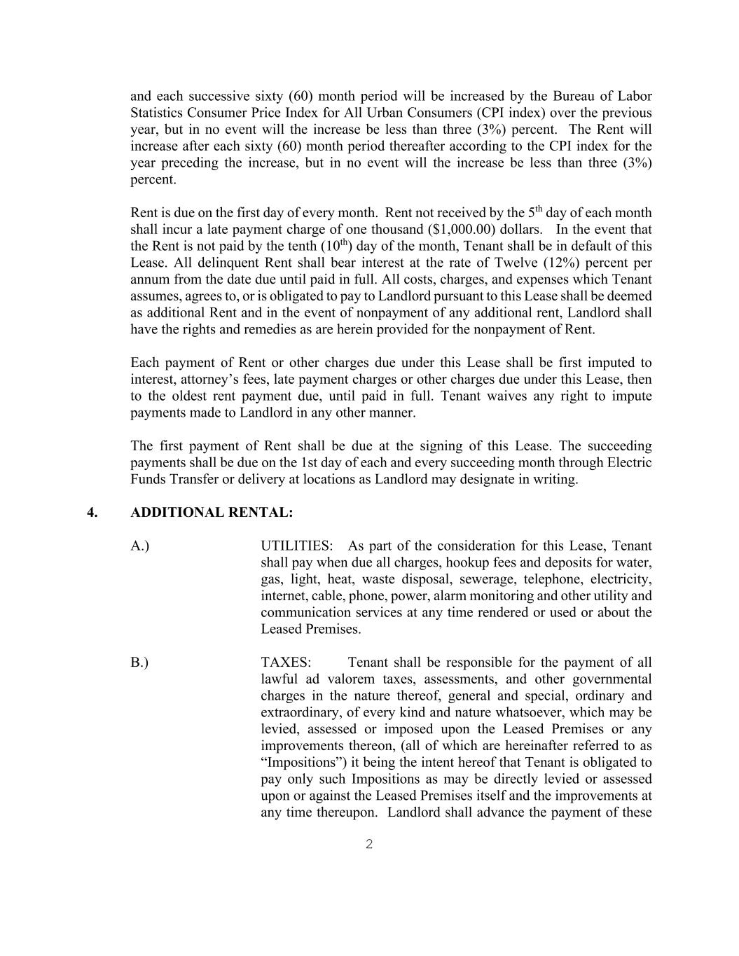 2 and each successive sixty (60) month period will be increased by the Bureau of Labor Statistics Consumer Price Index for All Urban Consumers (CPI index) over the previous year, but in no event will the increase be less than three (3%) percent. The Rent will increase after each sixty (60) month period thereafter according to the CPI index for the year preceding the increase, but in no event will the increase be less than three (3%) percent. Rent is due on the first day of every month. Rent not received by the 5th day of each month shall incur a late payment charge of one thousand ($1,000.00) dollars. In the event that the Rent is not paid by the tenth (10th) day of the month, Tenant shall be in default of this Lease. All delinquent Rent shall bear interest at the rate of Twelve (12%) percent per annum from the date due until paid in full. All costs, charges, and expenses which Tenant assumes, agrees to, or is obligated to pay to Landlord pursuant to this Lease shall be deemed as additional Rent and in the event of nonpayment of any additional rent, Landlord shall have the rights and remedies as are herein provided for the nonpayment of Rent. Each payment of Rent or other charges due under this Lease shall be first imputed to interest, attorney’s fees, late payment charges or other charges due under this Lease, then to the oldest rent payment due, until paid in full. Tenant waives any right to impute payments made to Landlord in any other manner. The first payment of Rent shall be due at the signing of this Lease. The succeeding payments shall be due on the 1st day of each and every succeeding month through Electric Funds Transfer or delivery at locations as Landlord may designate in writing. 4. ADDITIONAL RENTAL: A.) UTILITIES: As part of the consideration for this Lease, Tenant shall pay when due all charges, hookup fees and deposits for water, gas, light, heat, waste disposal, sewerage, telephone, electricity, internet, cable, phone, power, alarm monitoring and other utility and communication services at any time rendered or used or about the Leased Premises. B.) TAXES: Tenant shall be responsible for the payment of all lawful ad valorem taxes, assessments, and other governmental charges in the nature thereof, general and special, ordinary and extraordinary, of every kind and nature whatsoever, which may be levied, assessed or imposed upon the Leased Premises or any improvements thereon, (all of which are hereinafter referred to as “Impositions”) it being the intent hereof that Tenant is obligated to pay only such Impositions as may be directly levied or assessed upon or against the Leased Premises itself and the improvements at any time thereupon. Landlord shall advance the payment of these