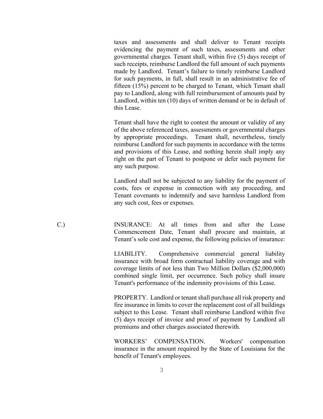 3 taxes and assessments and shall deliver to Tenant receipts evidencing the payment of such taxes, assessments and other governmental charges. Tenant shall, within five (5) days receipt of such receipts, reimburse Landlord the full amount of such payments made by Landlord. Tenant’s failure to timely reimburse Landlord for such payments, in full, shall result in an administrative fee of fifteen (15%) percent to be charged to Tenant, which Tenant shall pay to Landlord, along with full reimbursement of amounts paid by Landlord, within ten (10) days of written demand or be in default of this Lease. Tenant shall have the right to contest the amount or validity of any of the above referenced taxes, assessments or governmental charges by appropriate proceedings. Tenant shall, nevertheless, timely reimburse Landlord for such payments in accordance with the terms and provisions of this Lease, and nothing herein shall imply any right on the part of Tenant to postpone or defer such payment for any such purpose. Landlord shall not be subjected to any liability for the payment of costs, fees or expense in connection with any proceeding, and Tenant covenants to indemnify and save harmless Landlord from any such cost, fees or expenses. C.) INSURANCE: At all times from and after the Lease Commencement Date, Tenant shall procure and maintain, at Tenant’s sole cost and expense, the following policies of insurance: LIABILITY. Comprehensive commercial general liability insurance with broad form contractual liability coverage and with coverage limits of not less than Two Million Dollars ($2,000,000) combined single limit, per occurrence. Such policy shall insure Tenant's performance of the indemnity provisions of this Lease. PROPERTY. Landlord or tenant shall purchase all risk property and fire insurance in limits to cover the replacement cost of all buildings subject to this Lease. Tenant shall reimburse Landlord within five (5) days receipt of invoice and proof of payment by Landlord all premiums and other charges associated therewith. WORKERS’ COMPENSATION. Workers' compensation insurance in the amount required by the State of Louisiana for the benefit of Tenant's employees.