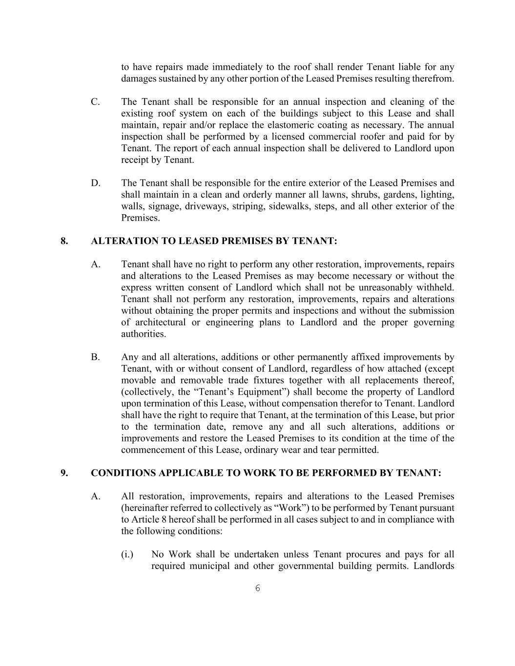6 to have repairs made immediately to the roof shall render Tenant liable for any damages sustained by any other portion of the Leased Premises resulting therefrom. C. The Tenant shall be responsible for an annual inspection and cleaning of the existing roof system on each of the buildings subject to this Lease and shall maintain, repair and/or replace the elastomeric coating as necessary. The annual inspection shall be performed by a licensed commercial roofer and paid for by Tenant. The report of each annual inspection shall be delivered to Landlord upon receipt by Tenant. D. The Tenant shall be responsible for the entire exterior of the Leased Premises and shall maintain in a clean and orderly manner all lawns, shrubs, gardens, lighting, walls, signage, driveways, striping, sidewalks, steps, and all other exterior of the Premises. 8. ALTERATION TO LEASED PREMISES BY TENANT: A. Tenant shall have no right to perform any other restoration, improvements, repairs and alterations to the Leased Premises as may become necessary or without the express written consent of Landlord which shall not be unreasonably withheld. Tenant shall not perform any restoration, improvements, repairs and alterations without obtaining the proper permits and inspections and without the submission of architectural or engineering plans to Landlord and the proper governing authorities. B. Any and all alterations, additions or other permanently affixed improvements by Tenant, with or without consent of Landlord, regardless of how attached (except movable and removable trade fixtures together with all replacements thereof, (collectively, the “Tenant’s Equipment”) shall become the property of Landlord upon termination of this Lease, without compensation therefor to Tenant. Landlord shall have the right to require that Tenant, at the termination of this Lease, but prior to the termination date, remove any and all such alterations, additions or improvements and restore the Leased Premises to its condition at the time of the commencement of this Lease, ordinary wear and tear permitted. 9. CONDITIONS APPLICABLE TO WORK TO BE PERFORMED BY TENANT: A. All restoration, improvements, repairs and alterations to the Leased Premises (hereinafter referred to collectively as “Work”) to be performed by Tenant pursuant to Article 8 hereof shall be performed in all cases subject to and in compliance with the following conditions: (i.) No Work shall be undertaken unless Tenant procures and pays for all required municipal and other governmental building permits. Landlords
