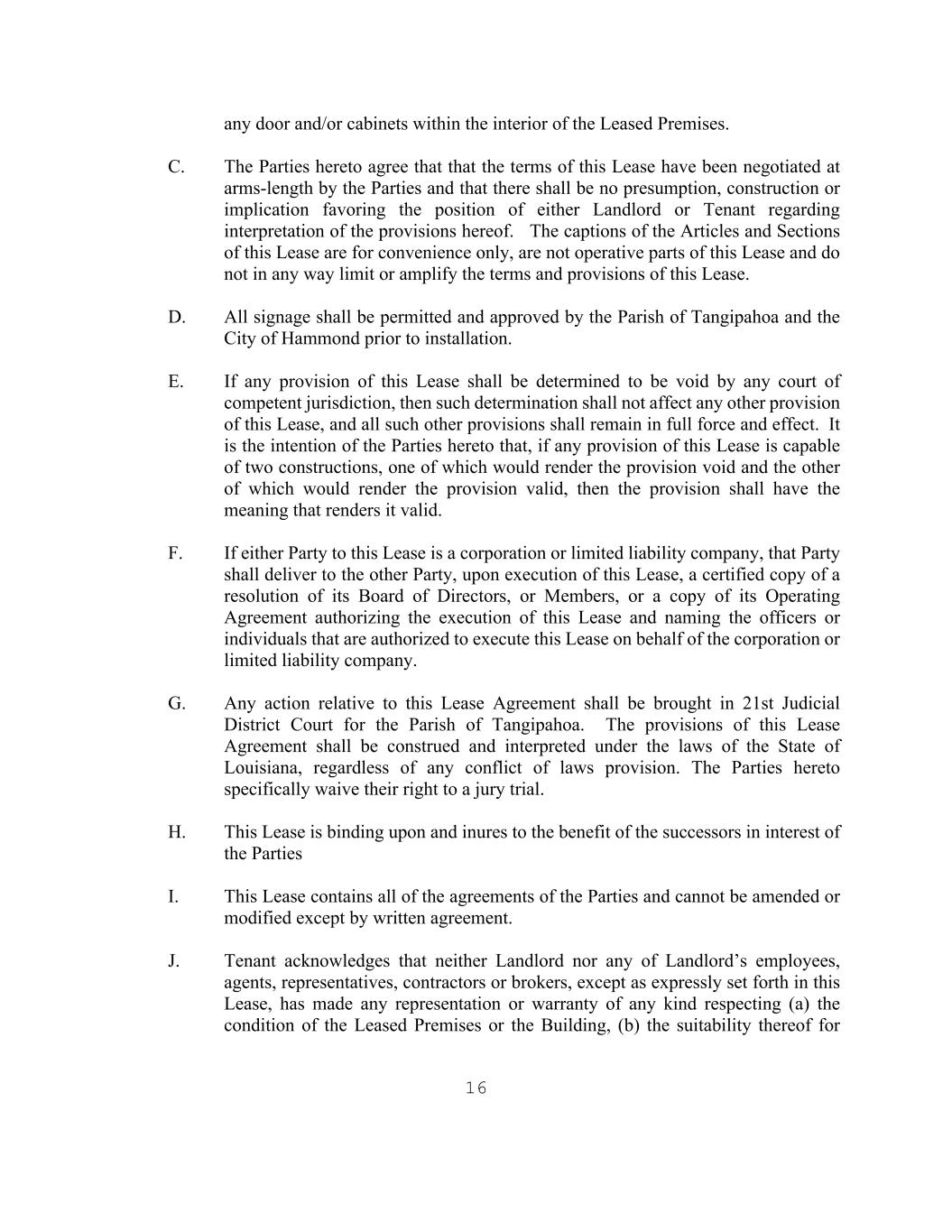 16 any door and/or cabinets within the interior of the Leased Premises. C. The Parties hereto agree that that the terms of this Lease have been negotiated at arms-length by the Parties and that there shall be no presumption, construction or implication favoring the position of either Landlord or Tenant regarding interpretation of the provisions hereof. The captions of the Articles and Sections of this Lease are for convenience only, are not operative parts of this Lease and do not in any way limit or amplify the terms and provisions of this Lease. D. All signage shall be permitted and approved by the Parish of Tangipahoa and the City of Hammond prior to installation. E. If any provision of this Lease shall be determined to be void by any court of competent jurisdiction, then such determination shall not affect any other provision of this Lease, and all such other provisions shall remain in full force and effect. It is the intention of the Parties hereto that, if any provision of this Lease is capable of two constructions, one of which would render the provision void and the other of which would render the provision valid, then the provision shall have the meaning that renders it valid. F. If either Party to this Lease is a corporation or limited liability company, that Party shall deliver to the other Party, upon execution of this Lease, a certified copy of a resolution of its Board of Directors, or Members, or a copy of its Operating Agreement authorizing the execution of this Lease and naming the officers or individuals that are authorized to execute this Lease on behalf of the corporation or limited liability company. G. Any action relative to this Lease Agreement shall be brought in 21st Judicial District Court for the Parish of Tangipahoa. The provisions of this Lease Agreement shall be construed and interpreted under the laws of the State of Louisiana, regardless of any conflict of laws provision. The Parties hereto specifically waive their right to a jury trial. H. This Lease is binding upon and inures to the benefit of the successors in interest of the Parties I. This Lease contains all of the agreements of the Parties and cannot be amended or modified except by written agreement. J. Tenant acknowledges that neither Landlord nor any of Landlord’s employees, agents, representatives, contractors or brokers, except as expressly set forth in this Lease, has made any representation or warranty of any kind respecting (a) the condition of the Leased Premises or the Building, (b) the suitability thereof for