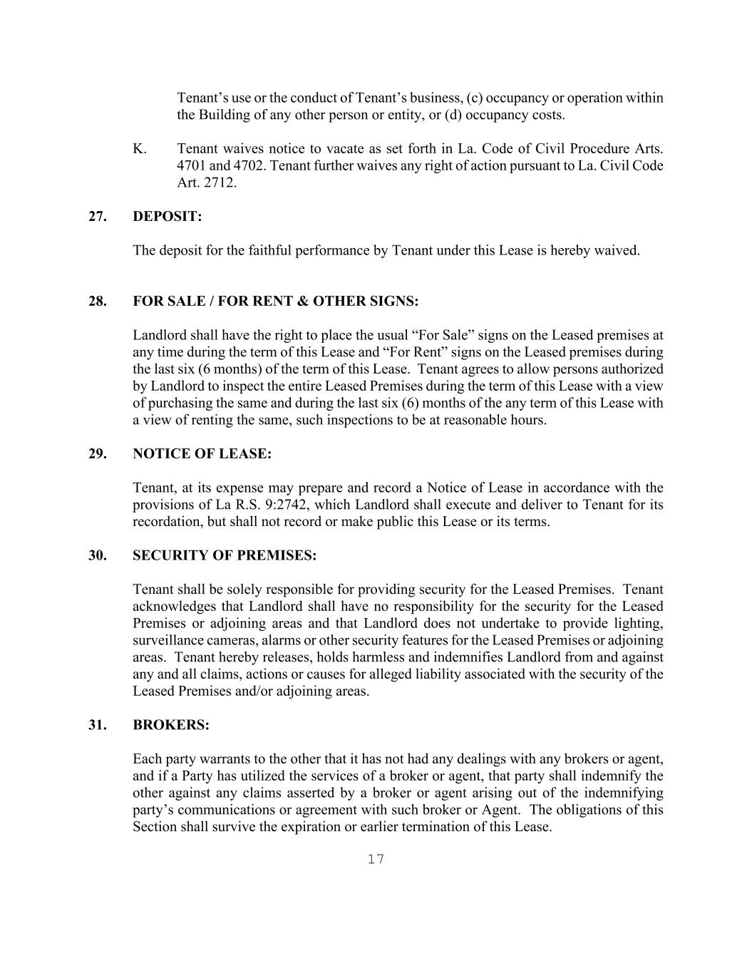 17 Tenant’s use or the conduct of Tenant’s business, (c) occupancy or operation within the Building of any other person or entity, or (d) occupancy costs. K. Tenant waives notice to vacate as set forth in La. Code of Civil Procedure Arts. 4701 and 4702. Tenant further waives any right of action pursuant to La. Civil Code Art. 2712. 27. DEPOSIT: The deposit for the faithful performance by Tenant under this Lease is hereby waived. 28. FOR SALE / FOR RENT & OTHER SIGNS: Landlord shall have the right to place the usual “For Sale” signs on the Leased premises at any time during the term of this Lease and “For Rent” signs on the Leased premises during the last six (6 months) of the term of this Lease. Tenant agrees to allow persons authorized by Landlord to inspect the entire Leased Premises during the term of this Lease with a view of purchasing the same and during the last six (6) months of the any term of this Lease with a view of renting the same, such inspections to be at reasonable hours. 29. NOTICE OF LEASE: Tenant, at its expense may prepare and record a Notice of Lease in accordance with the provisions of La R.S. 9:2742, which Landlord shall execute and deliver to Tenant for its recordation, but shall not record or make public this Lease or its terms. 30. SECURITY OF PREMISES: Tenant shall be solely responsible for providing security for the Leased Premises. Tenant acknowledges that Landlord shall have no responsibility for the security for the Leased Premises or adjoining areas and that Landlord does not undertake to provide lighting, surveillance cameras, alarms or other security features for the Leased Premises or adjoining areas. Tenant hereby releases, holds harmless and indemnifies Landlord from and against any and all claims, actions or causes for alleged liability associated with the security of the Leased Premises and/or adjoining areas. 31. BROKERS: Each party warrants to the other that it has not had any dealings with any brokers or agent, and if a Party has utilized the services of a broker or agent, that party shall indemnify the other against any claims asserted by a broker or agent arising out of the indemnifying party’s communications or agreement with such broker or Agent. The obligations of this Section shall survive the expiration or earlier termination of this Lease.