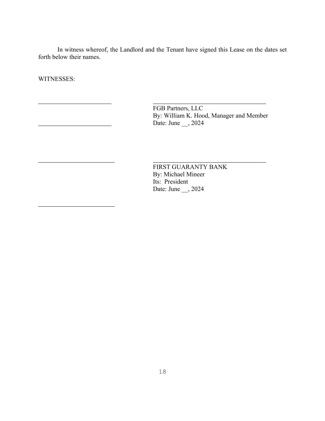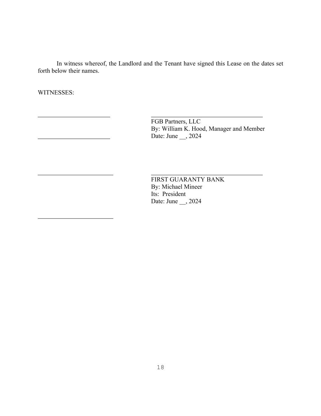 18 In witness whereof, the Landlord and the Tenant have signed this Lease on the dates set forth below their names. WITNESSES: FGB Partners, LLC By: William K. Hood, Manager and Member Date: June __, 2024 FIRST GUARANTY BANK By: Michael Mineer Its: President Date: June __, 2024