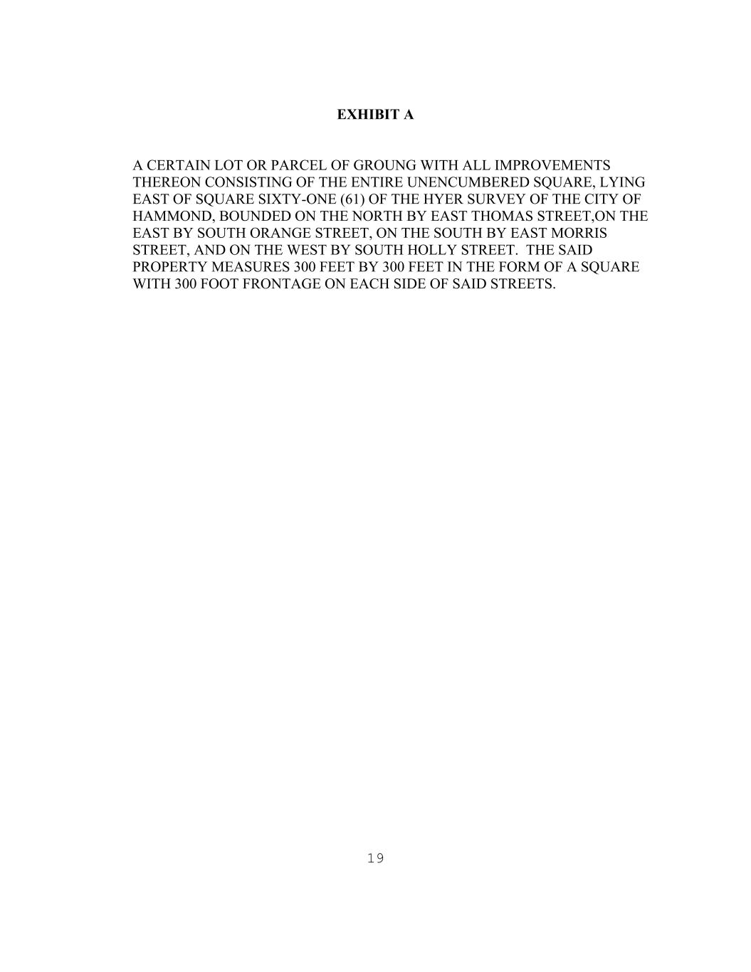 19 EXHIBIT A A CERTAIN LOT OR PARCEL OF GROUNG WITH ALL IMPROVEMENTS THEREON CONSISTING OF THE ENTIRE UNENCUMBERED SQUARE, LYING EAST OF SQUARE SIXTY-ONE (61) OF THE HYER SURVEY OF THE CITY OF HAMMOND, BOUNDED ON THE NORTH BY EAST THOMAS STREET,ON THE EAST BY SOUTH ORANGE STREET, ON THE SOUTH BY EAST MORRIS STREET, AND ON THE WEST BY SOUTH HOLLY STREET. THE SAID PROPERTY MEASURES 300 FEET BY 300 FEET IN THE FORM OF A SQUARE WITH 300 FOOT FRONTAGE ON EACH SIDE OF SAID STREETS.