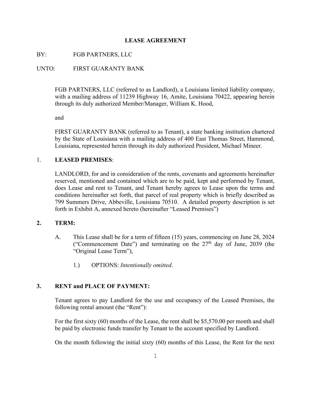 1 LEASE AGREEMENT BY: FGB PARTNERS, LLC UNTO: FIRST GUARANTY BANK FGB PARTNERS, LLC (referred to as Landlord), a Louisiana limited liability company, with a mailing address of 11239 Highway 16, Amite, Louisiana 70422, appearing herein through its duly authorized Member/Manager, William K. Hood, and FIRST GUARANTY BANK (referred to as Tenant), a state banking institution chartered by the State of Louisiana with a mailing address of 400 East Thomas Street, Hammond, Louisiana, represented herein through its duly authorized President, Michael Mineer. 1. LEASED PREMISES: LANDLORD, for and in consideration of the rents, covenants and agreements hereinafter reserved, mentioned and contained which are to be paid, kept and performed by Tenant, does Lease and rent to Tenant, and Tenant hereby agrees to Lease upon the terms and conditions hereinafter set forth, that parcel of real property which is briefly described as 799 Summers Drive, Abbeville, Louisiana 70510. A detailed property description is set forth in Exhibit A, annexed hereto (hereinafter “Leased Premises”) 2. TERM: A. This Lease shall be for a term of fifteen (15) years, commencing on June 28, 2024 (“Commencement Date”) and terminating on the 27th day of June, 2039 (the “Original Lease Term”), 1.) OPTIONS: Intentionally omitted. 3. RENT and PLACE OF PAYMENT: Tenant agrees to pay Landlord for the use and occupancy of the Leased Premises, the following rental amount (the “Rent”): For the first sixty (60) months of the Lease, the rent shall be $5,570.00 per month and shall be paid by electronic funds transfer by Tenant to the account specified by Landlord. On the month following the initial sixty (60) months of this Lease, the Rent for the next