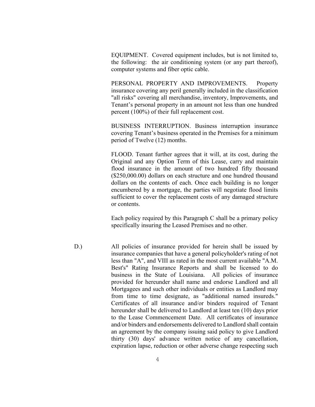 4 EQUIPMENT. Covered equipment includes, but is not limited to, the following: the air conditioning system (or any part thereof), computer systems and fiber optic cable. PERSONAL PROPERTY AND IMPROVEMENTS. Property insurance covering any peril generally included in the classification "all risks" covering all merchandise, inventory, Improvements, and Tenant’s personal property in an amount not less than one hundred percent (100%) of their full replacement cost. BUSINESS INTERRUPTION. Business interruption insurance covering Tenant’s business operated in the Premises for a minimum period of Twelve (12) months. FLOOD. Tenant further agrees that it will, at its cost, during the Original and any Option Term of this Lease, carry and maintain flood insurance in the amount of two hundred fifty thousand ($250,000.00) dollars on each structure and one hundred thousand dollars on the contents of each. Once each building is no longer encumbered by a mortgage, the parties will negotiate flood limits sufficient to cover the replacement costs of any damaged structure or contents. Each policy required by this Paragraph C shall be a primary policy specifically insuring the Leased Premises and no other. D.) All policies of insurance provided for herein shall be issued by insurance companies that have a general policyholder's rating of not less than "A", and VIII as rated in the most current available "A.M. Best's" Rating Insurance Reports and shall be licensed to do business in the State of Louisiana. All policies of insurance provided for hereunder shall name and endorse Landlord and all Mortgagees and such other individuals or entities as Landlord may from time to time designate, as "additional named insureds." Certificates of all insurance and/or binders required of Tenant hereunder shall be delivered to Landlord at least ten (10) days prior to the Lease Commencement Date. All certificates of insurance and/or binders and endorsements delivered to Landlord shall contain an agreement by the company issuing said policy to give Landlord thirty (30) days' advance written notice of any cancellation, expiration lapse, reduction or other adverse change respecting such