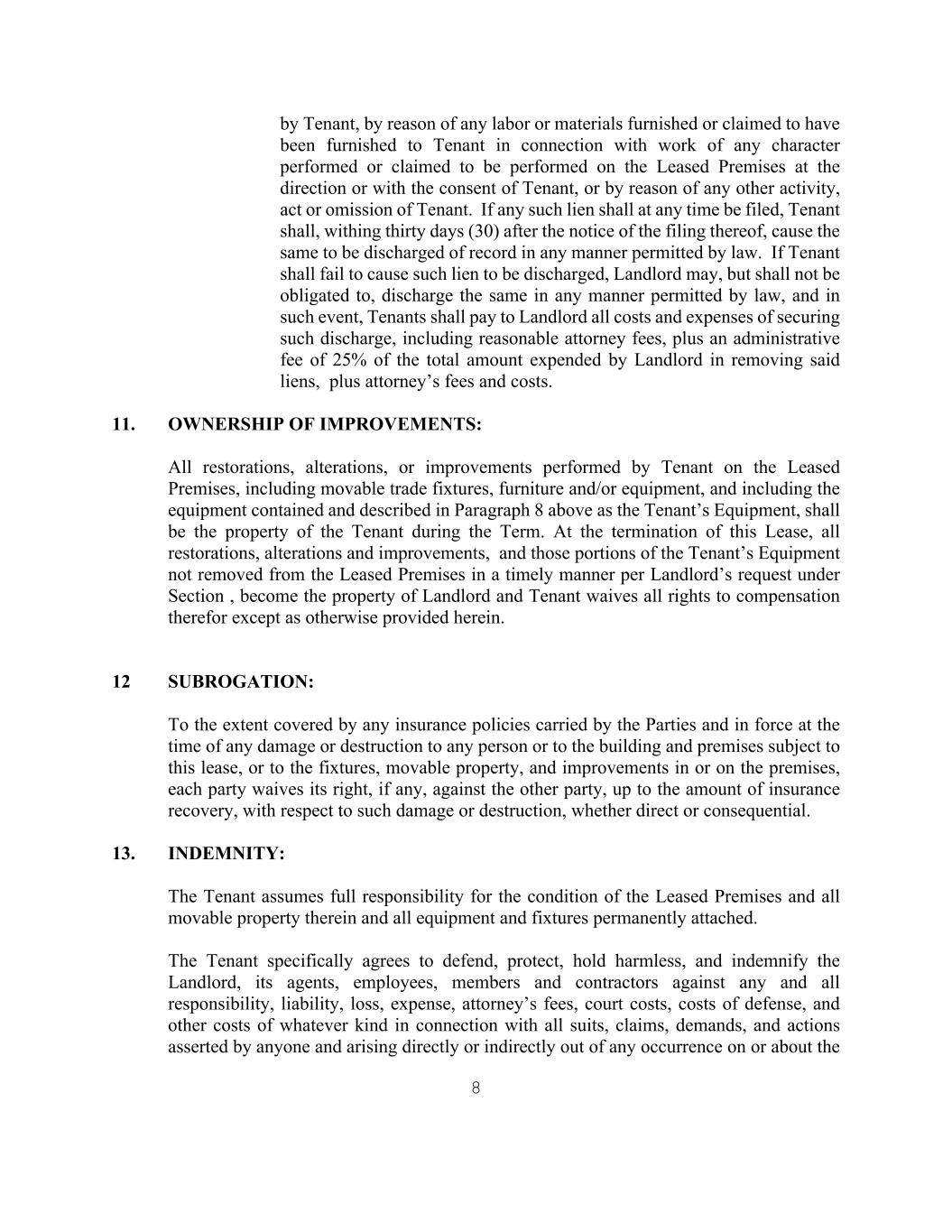 8 by Tenant, by reason of any labor or materials furnished or claimed to have been furnished to Tenant in connection with work of any character performed or claimed to be performed on the Leased Premises at the direction or with the consent of Tenant, or by reason of any other activity, act or omission of Tenant. If any such lien shall at any time be filed, Tenant shall, withing thirty days (30) after the notice of the filing thereof, cause the same to be discharged of record in any manner permitted by law. If Tenant shall fail to cause such lien to be discharged, Landlord may, but shall not be obligated to, discharge the same in any manner permitted by law, and in such event, Tenants shall pay to Landlord all costs and expenses of securing such discharge, including reasonable attorney fees, plus an administrative fee of 25% of the total amount expended by Landlord in removing said liens, plus attorney’s fees and costs. 11. OWNERSHIP OF IMPROVEMENTS: All restorations, alterations, or improvements performed by Tenant on the Leased Premises, including movable trade fixtures, furniture and/or equipment, and including the equipment contained and described in Paragraph 8 above as the Tenant’s Equipment, shall be the property of the Tenant during the Term. At the termination of this Lease, all restorations, alterations and improvements, and those portions of the Tenant’s Equipment not removed from the Leased Premises in a timely manner per Landlord’s request under Section , become the property of Landlord and Tenant waives all rights to compensation therefor except as otherwise provided herein. 12 SUBROGATION: To the extent covered by any insurance policies carried by the Parties and in force at the time of any damage or destruction to any person or to the building and premises subject to this lease, or to the fixtures, movable property, and improvements in or on the premises, each party waives its right, if any, against the other party, up to the amount of insurance recovery, with respect to such damage or destruction, whether direct or consequential. 13. INDEMNITY: The Tenant assumes full responsibility for the condition of the Leased Premises and all movable property therein and all equipment and fixtures permanently attached. The Tenant specifically agrees to defend, protect, hold harmless, and indemnify the Landlord, its agents, employees, members and contractors against any and all responsibility, liability, loss, expense, attorney’s fees, court costs, costs of defense, and other costs of whatever kind in connection with all suits, claims, demands, and actions asserted by anyone and arising directly or indirectly out of any occurrence on or about the