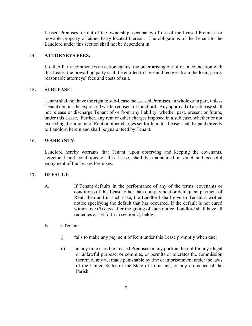 9 Leased Premises, or out of the ownership, occupancy of use of the Leased Premises or movable property of either Party located thereon. The obligations of the Tenant to the Landlord under this section shall not be dependent in. 14 ATTORNEYS FEES: If either Party commences an action against the other arising out of or in connection with this Lease, the prevailing party shall be entitled to have and recover from the losing party reasonable attorneys’ fees and costs of suit. 15. SUBLEASE: Tenant shall not have the right to sub-Lease the Leased Premises, in whole or in part, unless Tenant obtains the expressed written consent of Landlord. Any approval of a sublease shall not release or discharge Tenant of or from any liability, whether past, present or future, under this Lease. Further, any rent or other charges imposed in a sublease, whether or not exceeding the amount of Rent or other charges set forth in this Lease, shall be paid directly to Landlord herein and shall be guaranteed by Tenant. 16. WARRANTY: Landlord hereby warrants that Tenant, upon observing and keeping the covenants, agreement and conditions of this Lease, shall be maintained in quiet and peaceful enjoyment of the Leases Premises. 17. DEFAULT: A. If Tenant defaults in the performance of any of the terms, covenants or conditions of this Lease, other than non-payment or delinquent payment of Rent, then and in such case, the Landlord shall give to Tenant a written notice specifying the default that has occurred. If the default is not cured within five (5) days after the giving of such notice, Landlord shall have all remedies as set forth in section C, below. B. If Tenant: i.) fails to make any payment of Rent under this Lease promptly when due; ii.) at any time uses the Leased Premises or any portion thereof for any illegal or unlawful purpose, or commits, or permits or tolerates the commission therein of any act made punishable by fine or imprisonment under the laws of the United States or the State of Louisiana, or any ordinance of the Parish;