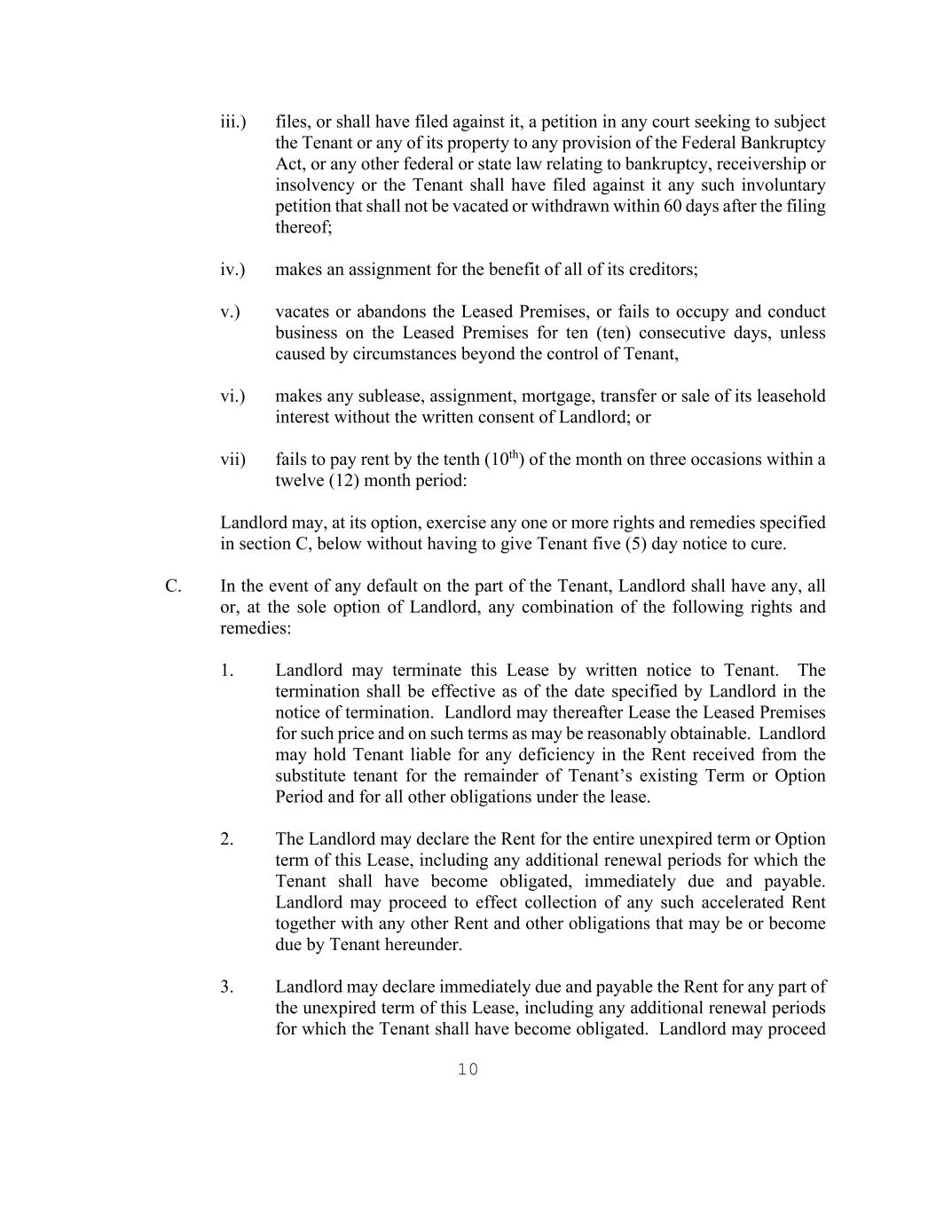 10 iii.) files, or shall have filed against it, a petition in any court seeking to subject the Tenant or any of its property to any provision of the Federal Bankruptcy Act, or any other federal or state law relating to bankruptcy, receivership or insolvency or the Tenant shall have filed against it any such involuntary petition that shall not be vacated or withdrawn within 60 days after the filing thereof; iv.) makes an assignment for the benefit of all of its creditors; v.) vacates or abandons the Leased Premises, or fails to occupy and conduct business on the Leased Premises for ten (ten) consecutive days, unless caused by circumstances beyond the control of Tenant, vi.) makes any sublease, assignment, mortgage, transfer or sale of its leasehold interest without the written consent of Landlord; or vii) fails to pay rent by the tenth (10th) of the month on three occasions within a twelve (12) month period: Landlord may, at its option, exercise any one or more rights and remedies specified in section C, below without having to give Tenant five (5) day notice to cure. C. In the event of any default on the part of the Tenant, Landlord shall have any, all or, at the sole option of Landlord, any combination of the following rights and remedies: 1. Landlord may terminate this Lease by written notice to Tenant. The termination shall be effective as of the date specified by Landlord in the notice of termination. Landlord may thereafter Lease the Leased Premises for such price and on such terms as may be reasonably obtainable. Landlord may hold Tenant liable for any deficiency in the Rent received from the substitute tenant for the remainder of Tenant’s existing Term or Option Period and for all other obligations under the lease. 2. The Landlord may declare the Rent for the entire unexpired term or Option term of this Lease, including any additional renewal periods for which the Tenant shall have become obligated, immediately due and payable. Landlord may proceed to effect collection of any such accelerated Rent together with any other Rent and other obligations that may be or become due by Tenant hereunder. 3. Landlord may declare immediately due and payable the Rent for any part of the unexpired term of this Lease, including any additional renewal periods for which the Tenant shall have become obligated. Landlord may proceed