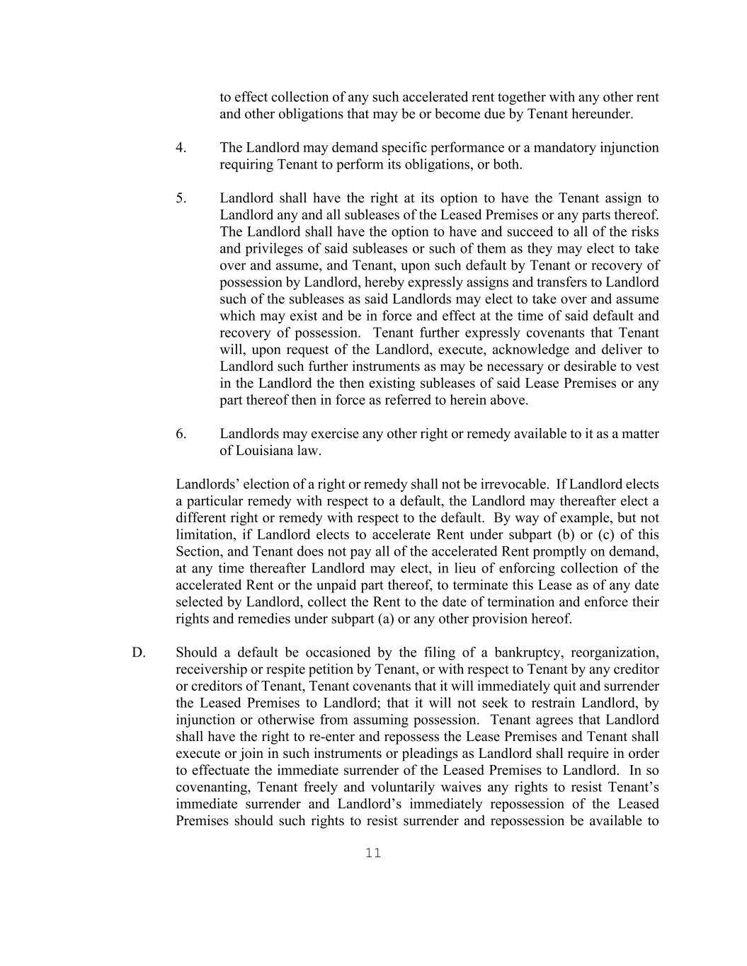 11 to effect collection of any such accelerated rent together with any other rent and other obligations that may be or become due by Tenant hereunder. 4. The Landlord may demand specific performance or a mandatory injunction requiring Tenant to perform its obligations, or both. 5. Landlord shall have the right at its option to have the Tenant assign to Landlord any and all subleases of the Leased Premises or any parts thereof. The Landlord shall have the option to have and succeed to all of the risks and privileges of said subleases or such of them as they may elect to take over and assume, and Tenant, upon such default by Tenant or recovery of possession by Landlord, hereby expressly assigns and transfers to Landlord such of the subleases as said Landlords may elect to take over and assume which may exist and be in force and effect at the time of said default and recovery of possession. Tenant further expressly covenants that Tenant will, upon request of the Landlord, execute, acknowledge and deliver to Landlord such further instruments as may be necessary or desirable to vest in the Landlord the then existing subleases of said Lease Premises or any part thereof then in force as referred to herein above. 6. Landlords may exercise any other right or remedy available to it as a matter of Louisiana law. Landlords’ election of a right or remedy shall not be irrevocable. If Landlord elects a particular remedy with respect to a default, the Landlord may thereafter elect a different right or remedy with respect to the default. By way of example, but not limitation, if Landlord elects to accelerate Rent under subpart (b) or (c) of this Section, and Tenant does not pay all of the accelerated Rent promptly on demand, at any time thereafter Landlord may elect, in lieu of enforcing collection of the accelerated Rent or the unpaid part thereof, to terminate this Lease as of any date selected by Landlord, collect the Rent to the date of termination and enforce their rights and remedies under subpart (a) or any other provision hereof. D. Should a default be occasioned by the filing of a bankruptcy, reorganization, receivership or respite petition by Tenant, or with respect to Tenant by any creditor or creditors of Tenant, Tenant covenants that it will immediately quit and surrender the Leased Premises to Landlord; that it will not seek to restrain Landlord, by injunction or otherwise from assuming possession. Tenant agrees that Landlord shall have the right to re-enter and repossess the Lease Premises and Tenant shall execute or join in such instruments or pleadings as Landlord shall require in order to effectuate the immediate surrender of the Leased Premises to Landlord. In so covenanting, Tenant freely and voluntarily waives any rights to resist Tenant’s immediate surrender and Landlord’s immediately repossession of the Leased Premises should such rights to resist surrender and repossession be available to