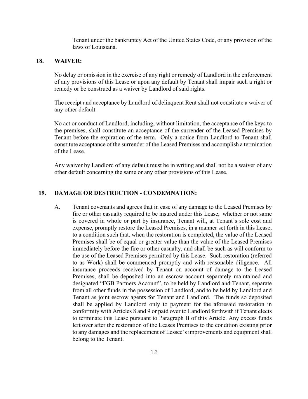 12 Tenant under the bankruptcy Act of the United States Code, or any provision of the laws of Louisiana. 18. WAIVER: No delay or omission in the exercise of any right or remedy of Landlord in the enforcement of any provisions of this Lease or upon any default by Tenant shall impair such a right or remedy or be construed as a waiver by Landlord of said rights. The receipt and acceptance by Landlord of delinquent Rent shall not constitute a waiver of any other default. No act or conduct of Landlord, including, without limitation, the acceptance of the keys to the premises, shall constitute an acceptance of the surrender of the Leased Premises by Tenant before the expiration of the term. Only a notice from Landlord to Tenant shall constitute acceptance of the surrender of the Leased Premises and accomplish a termination of the Lease. Any waiver by Landlord of any default must be in writing and shall not be a waiver of any other default concerning the same or any other provisions of this Lease. 19. DAMAGE OR DESTRUCTION - CONDEMNATION: A. Tenant covenants and agrees that in case of any damage to the Leased Premises by fire or other casualty required to be insured under this Lease, whether or not same is covered in whole or part by insurance, Tenant will, at Tenant’s sole cost and expense, promptly restore the Leased Premises, in a manner set forth in this Lease, to a condition such that, when the restoration is completed, the value of the Leased Premises shall be of equal or greater value than the value of the Leased Premises immediately before the fire or other casualty, and shall be such as will conform to the use of the Leased Premises permitted by this Lease. Such restoration (referred to as Work) shall be commenced promptly and with reasonable diligence. All insurance proceeds received by Tenant on account of damage to the Leased Premises, shall be deposited into an escrow account separately maintained and designated “FGB Partners Account”, to be held by Landlord and Tenant, separate from all other funds in the possession of Landlord, and to be held by Landlord and Tenant as joint escrow agents for Tenant and Landlord. The funds so deposited shall be applied by Landlord only to payment for the aforesaid restoration in conformity with Articles 8 and 9 or paid over to Landlord forthwith if Tenant elects to terminate this Lease pursuant to Paragraph B of this Article. Any excess funds left over after the restoration of the Leases Premises to the condition existing prior to any damages and the replacement of Lessee’s improvements and equipment shall belong to the Tenant.