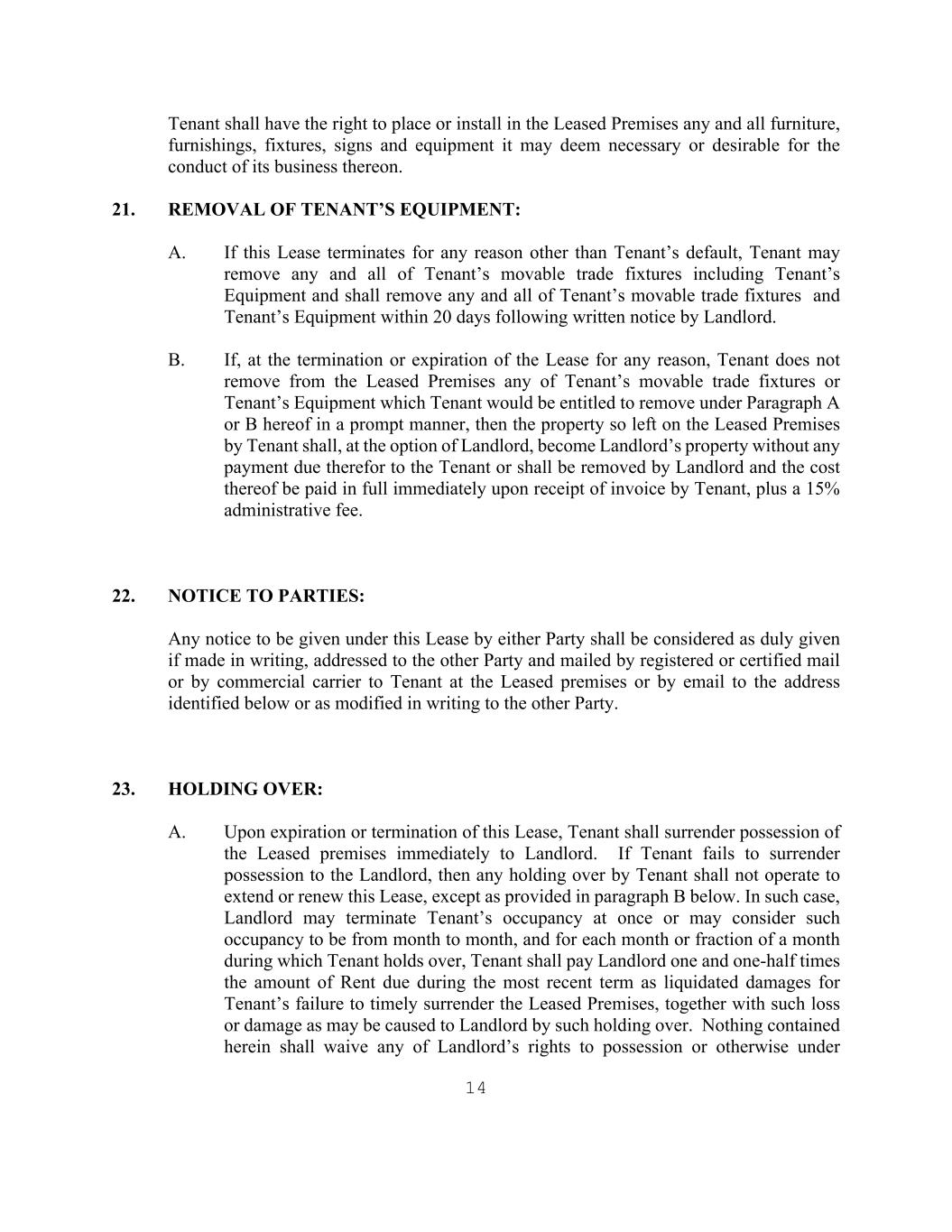 14 Tenant shall have the right to place or install in the Leased Premises any and all furniture, furnishings, fixtures, signs and equipment it may deem necessary or desirable for the conduct of its business thereon. 21. REMOVAL OF TENANT’S EQUIPMENT: A. If this Lease terminates for any reason other than Tenant’s default, Tenant may remove any and all of Tenant’s movable trade fixtures including Tenant’s Equipment and shall remove any and all of Tenant’s movable trade fixtures and Tenant’s Equipment within 20 days following written notice by Landlord. B. If, at the termination or expiration of the Lease for any reason, Tenant does not remove from the Leased Premises any of Tenant’s movable trade fixtures or Tenant’s Equipment which Tenant would be entitled to remove under Paragraph A or B hereof in a prompt manner, then the property so left on the Leased Premises by Tenant shall, at the option of Landlord, become Landlord’s property without any payment due therefor to the Tenant or shall be removed by Landlord and the cost thereof be paid in full immediately upon receipt of invoice by Tenant, plus a 15% administrative fee. 22. NOTICE TO PARTIES: Any notice to be given under this Lease by either Party shall be considered as duly given if made in writing, addressed to the other Party and mailed by registered or certified mail or by commercial carrier to Tenant at the Leased premises or by email to the address identified below or as modified in writing to the other Party. 23. HOLDING OVER: A. Upon expiration or termination of this Lease, Tenant shall surrender possession of the Leased premises immediately to Landlord. If Tenant fails to surrender possession to the Landlord, then any holding over by Tenant shall not operate to extend or renew this Lease, except as provided in paragraph B below. In such case, Landlord may terminate Tenant’s occupancy at once or may consider such occupancy to be from month to month, and for each month or fraction of a month during which Tenant holds over, Tenant shall pay Landlord one and one-half times the amount of Rent due during the most recent term as liquidated damages for Tenant’s failure to timely surrender the Leased Premises, together with such loss or damage as may be caused to Landlord by such holding over. Nothing contained herein shall waive any of Landlord’s rights to possession or otherwise under