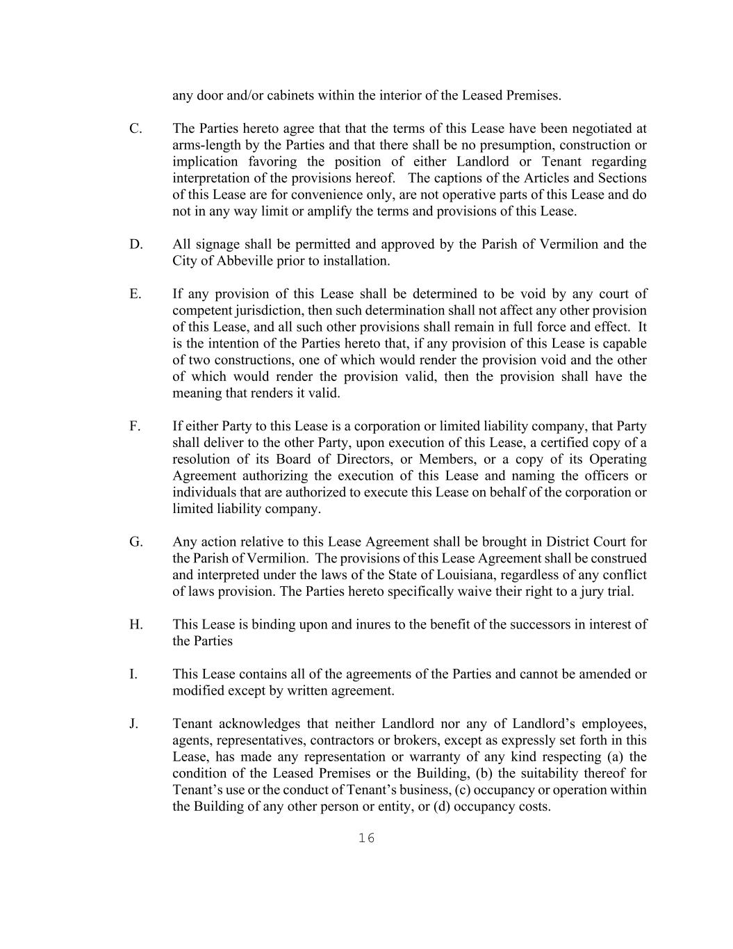16 any door and/or cabinets within the interior of the Leased Premises. C. The Parties hereto agree that that the terms of this Lease have been negotiated at arms-length by the Parties and that there shall be no presumption, construction or implication favoring the position of either Landlord or Tenant regarding interpretation of the provisions hereof. The captions of the Articles and Sections of this Lease are for convenience only, are not operative parts of this Lease and do not in any way limit or amplify the terms and provisions of this Lease. D. All signage shall be permitted and approved by the Parish of Vermilion and the City of Abbeville prior to installation. E. If any provision of this Lease shall be determined to be void by any court of competent jurisdiction, then such determination shall not affect any other provision of this Lease, and all such other provisions shall remain in full force and effect. It is the intention of the Parties hereto that, if any provision of this Lease is capable of two constructions, one of which would render the provision void and the other of which would render the provision valid, then the provision shall have the meaning that renders it valid. F. If either Party to this Lease is a corporation or limited liability company, that Party shall deliver to the other Party, upon execution of this Lease, a certified copy of a resolution of its Board of Directors, or Members, or a copy of its Operating Agreement authorizing the execution of this Lease and naming the officers or individuals that are authorized to execute this Lease on behalf of the corporation or limited liability company. G. Any action relative to this Lease Agreement shall be brought in District Court for the Parish of Vermilion. The provisions of this Lease Agreement shall be construed and interpreted under the laws of the State of Louisiana, regardless of any conflict of laws provision. The Parties hereto specifically waive their right to a jury trial. H. This Lease is binding upon and inures to the benefit of the successors in interest of the Parties I. This Lease contains all of the agreements of the Parties and cannot be amended or modified except by written agreement. J. Tenant acknowledges that neither Landlord nor any of Landlord’s employees, agents, representatives, contractors or brokers, except as expressly set forth in this Lease, has made any representation or warranty of any kind respecting (a) the condition of the Leased Premises or the Building, (b) the suitability thereof for Tenant’s use or the conduct of Tenant’s business, (c) occupancy or operation within the Building of any other person or entity, or (d) occupancy costs.