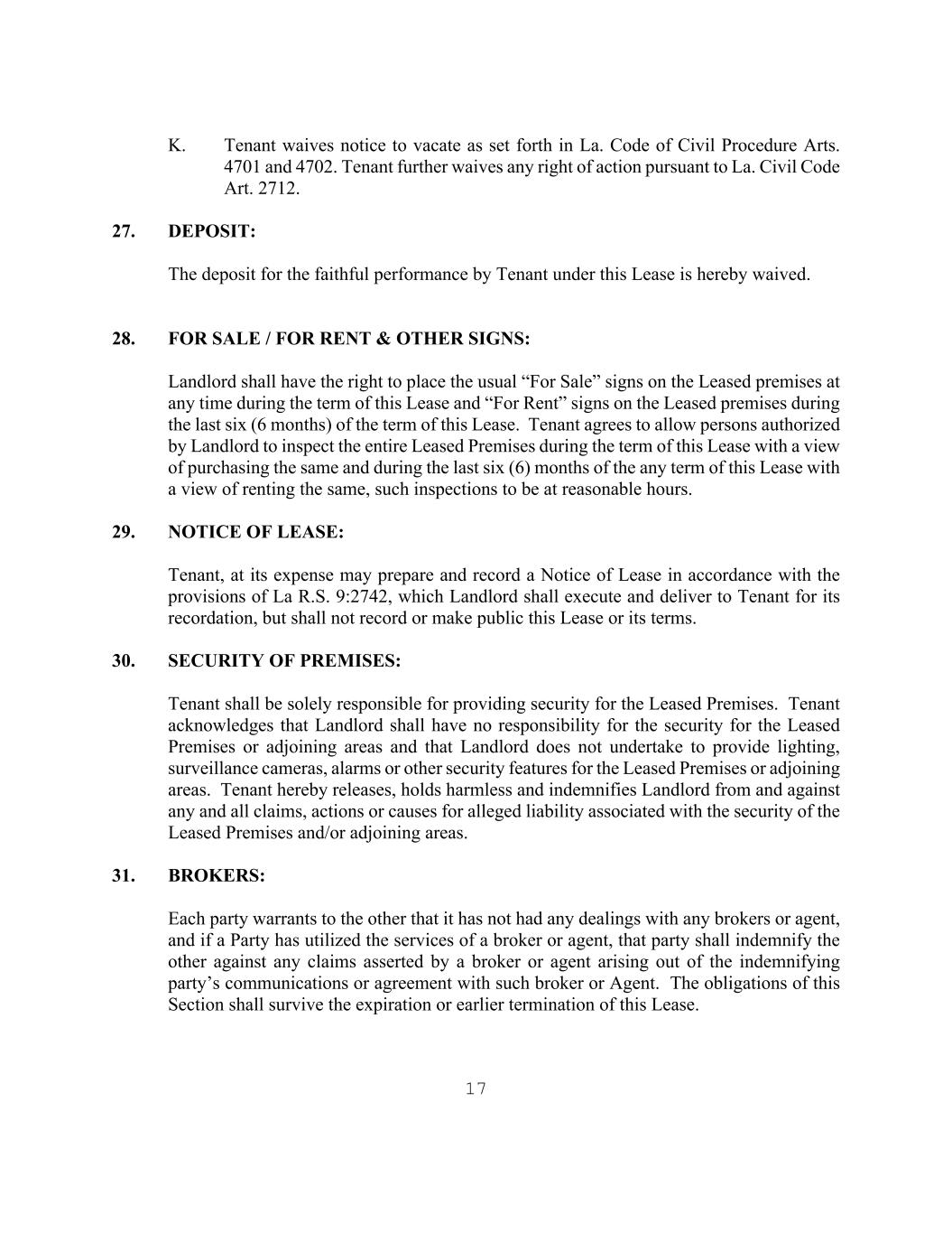 17 K. Tenant waives notice to vacate as set forth in La. Code of Civil Procedure Arts. 4701 and 4702. Tenant further waives any right of action pursuant to La. Civil Code Art. 2712. 27. DEPOSIT: The deposit for the faithful performance by Tenant under this Lease is hereby waived. 28. FOR SALE / FOR RENT & OTHER SIGNS: Landlord shall have the right to place the usual “For Sale” signs on the Leased premises at any time during the term of this Lease and “For Rent” signs on the Leased premises during the last six (6 months) of the term of this Lease. Tenant agrees to allow persons authorized by Landlord to inspect the entire Leased Premises during the term of this Lease with a view of purchasing the same and during the last six (6) months of the any term of this Lease with a view of renting the same, such inspections to be at reasonable hours. 29. NOTICE OF LEASE: Tenant, at its expense may prepare and record a Notice of Lease in accordance with the provisions of La R.S. 9:2742, which Landlord shall execute and deliver to Tenant for its recordation, but shall not record or make public this Lease or its terms. 30. SECURITY OF PREMISES: Tenant shall be solely responsible for providing security for the Leased Premises. Tenant acknowledges that Landlord shall have no responsibility for the security for the Leased Premises or adjoining areas and that Landlord does not undertake to provide lighting, surveillance cameras, alarms or other security features for the Leased Premises or adjoining areas. Tenant hereby releases, holds harmless and indemnifies Landlord from and against any and all claims, actions or causes for alleged liability associated with the security of the Leased Premises and/or adjoining areas. 31. BROKERS: Each party warrants to the other that it has not had any dealings with any brokers or agent, and if a Party has utilized the services of a broker or agent, that party shall indemnify the other against any claims asserted by a broker or agent arising out of the indemnifying party’s communications or agreement with such broker or Agent. The obligations of this Section shall survive the expiration or earlier termination of this Lease.