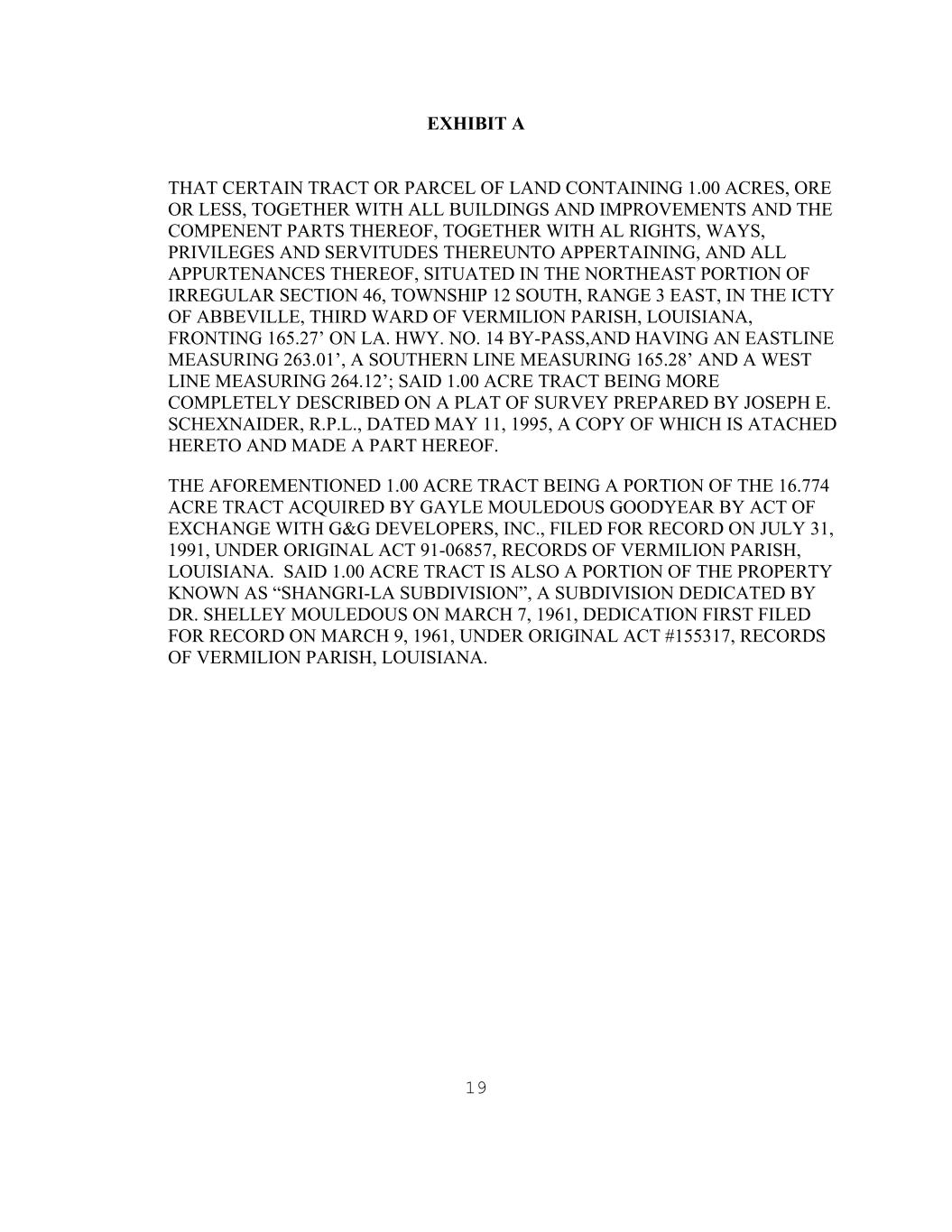 19 EXHIBIT A THAT CERTAIN TRACT OR PARCEL OF LAND CONTAINING 1.00 ACRES, ORE OR LESS, TOGETHER WITH ALL BUILDINGS AND IMPROVEMENTS AND THE COMPENENT PARTS THEREOF, TOGETHER WITH AL RIGHTS, WAYS, PRIVILEGES AND SERVITUDES THEREUNTO APPERTAINING, AND ALL APPURTENANCES THEREOF, SITUATED IN THE NORTHEAST PORTION OF IRREGULAR SECTION 46, TOWNSHIP 12 SOUTH, RANGE 3 EAST, IN THE ICTY OF ABBEVILLE, THIRD WARD OF VERMILION PARISH, LOUISIANA, FRONTING 165.27’ ON LA. HWY. NO. 14 BY-PASS,AND HAVING AN EASTLINE MEASURING 263.01’, A SOUTHERN LINE MEASURING 165.28’ AND A WEST LINE MEASURING 264.12’; SAID 1.00 ACRE TRACT BEING MORE COMPLETELY DESCRIBED ON A PLAT OF SURVEY PREPARED BY JOSEPH E. SCHEXNAIDER, R.P.L., DATED MAY 11, 1995, A COPY OF WHICH IS ATACHED HERETO AND MADE A PART HEREOF. THE AFOREMENTIONED 1.00 ACRE TRACT BEING A PORTION OF THE 16.774 ACRE TRACT ACQUIRED BY GAYLE MOULEDOUS GOODYEAR BY ACT OF EXCHANGE WITH G&G DEVELOPERS, INC., FILED FOR RECORD ON JULY 31, 1991, UNDER ORIGINAL ACT 91-06857, RECORDS OF VERMILION PARISH, LOUISIANA. SAID 1.00 ACRE TRACT IS ALSO A PORTION OF THE PROPERTY KNOWN AS “SHANGRI-LA SUBDIVISION”, A SUBDIVISION DEDICATED BY DR. SHELLEY MOULEDOUS ON MARCH 7, 1961, DEDICATION FIRST FILED FOR RECORD ON MARCH 9, 1961, UNDER ORIGINAL ACT #155317, RECORDS OF VERMILION PARISH, LOUISIANA.