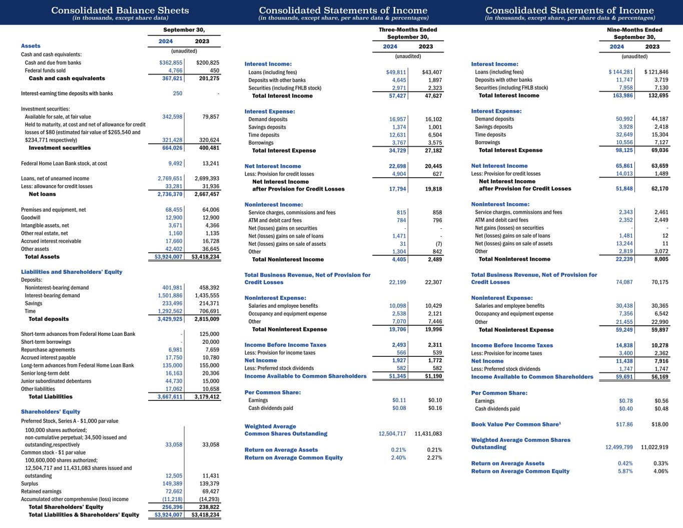 Consolidated Balance Sheets (in thousands, except share data) Consolidated Statements of Income (in thousands, except share, per share data & percentages) Consolidated Statements of Income (in thousands, except share, per share data & percentages) Assets Cash and cash equivalents: Cash and due from banks $362,855 $200,825 Federal funds sold 4,766 450 Cash and cash equivalents 367,621 201,275 Interest-earning time deposits with banks 250 - Investment securities: Available for sale, at fair value 342,598 79,857 Held to maturity, at cost and net of allowance for credit losses of $80 (estimated fair value of $265,540 and $234,771 respectively) 321,428 320,624 Investment securities 664,026 400,481 Federal Home Loan Bank stock, at cost 9,492 13,241 Loans, net of unearned income 2,769,651 2,699,393 Less: allowance for credit losses 33,281 31,936 Net loans 2,736,370 2,667,457 Premises and equipment, net 68,455 64,006 Goodwill 12,900 12,900 Intangible assets, net 3,671 4,366 Other real estate, net 1,160 1,135 Accrued interest receivable 17,660 16,728 Other assets 42,402 36,645 Total Assets $3,924,007 $3,418,234 Liabilities and Shareholders’ Equity Deposits: Noninterest-bearing demand 401,981 458,392 Interest-bearing demand 1,501,886 1,435,555 Savings 233,496 214,371 Time 1,292,562 706,691 Total deposits 3,429,925 2,815,009 Short-term advances from Federal Home Loan Bank - 125,000 Short-term borrowings - 20,000 Repurchase agreements 6,981 7,659 Accrued interest payable 17,750 10,780 Long-term advances from Federal Home Loan Bank 135,000 155,000 Senior long-term debt 16,163 20,306 Junior subordinated debentures 44,730 15,000 Other liabilities 17,062 10,658 Total Liabilities 3,667,611 3,179,412 Shareholders’ Equity Preferred Stock, Series A - $1,000 par value 100,000 shares authorized; non-cumulative perpetual; 34,500 issued and outstanding,respectively 33,058 33,058 Common stock - $1 par value 100,600,000 shares authorized; 12,504,717 and 11,431,083 shares issued and outstanding 12,505 11,431 Surplus 149,389 139,379 Retained earnings 72,662 69,427 Accumulated other comprehensive (loss) income (11,218) (14,293) Total Shareholders’ Equity 256,396 238,822 Total Liabilities & Shareholders’ Equity $3,924,007 $3,418,234 September 30, 2024 2023 (unaudited) Three-Months Ended September 30, 2024 2023 (unaudited) Interest Income: Loans (including fees) $49,811 $43,407 Deposits with other banks 4,645 1,897 Securities (including FHLB stock) 2,971 2,323 Total Interest Income 57,427 47,627 Interest Expense: Demand deposits 16,957 16,102 Savings deposits 1,374 1,001 Time deposits 12,631 6,504 Borrowings 3,767 3,575 Total Interest Expense 34,729 27,182 Net Interest Income 22,698 20,445 Less: Provision for credit losses 4,904 627 Net Interest Income after Provision for Credit Losses 17,794 19,818 Noninterest Income: Service charges, commissions and fees 815 858 ATM and debit card fees 784 796 Net (losses) gains on securities - - Net (losses) gains on sale of loans 1,471 - Net (losses) gains on sale of assets 31 (7) Other 1,304 842 Total Noninterest Income 4,405 2,489 Total Business Revenue, Net of Provision for Credit Losses 22,199 22,307 Noninterest Expense: Salaries and employee benefits 10,098 10,429 Occupancy and equipment expense 2,538 2,121 Other 7,070 7,446 Total Noninterest Expense 19,706 19,996 Income Before Income Taxes 2,493 2,311 Less: Provision for income taxes 566 539 Net Income 1,927 1,772 Less: Preferred stock dividends 582 582 Income Available to Common Shareholders $1,345 $1,190 Per Common Share: Earnings $0.11 $0.10 Cash dividends paid $0.08 $0.16 Weighted Average Common Shares Outstanding 12,504,717 11,431,083 Return on Average Assets 0.21% 0.21% Return on Average Common Equity 2.40% 2.27% Nine-Months Ended September 30, 2024 2023 (unaudited) Interest Income: Loans (including fees) $ 144,281 $ 121,846 Deposits with other banks 11,747 3,719 Securities (including FHLB stock) 7,958 7,130 Total Interest Income 163,986 132,695 Interest Expense: Demand deposits 50,992 44,187 Savings deposits 3,928 2,418 Time deposits 32,649 15,304 Borrowings 10,556 7,127 Total Interest Expense 98,125 69,036 Net Interest Income 65,861 63,659 Less: Provision for credit losses 14,013 1,489 Net Interest Income after Provision for Credit Losses 51,848 62,170 Noninterest Income: Service charges, commissions and fees 2,343 2,461 ATM and debit card fees 2,352 2,449 Net gains (losses) on securities - - Net (losses) gains on sale of loans 1,481 12 Net (losses) gains on sale of assets 13,244 11 Other 2,819 3,072 Total Noninterest Income 22,239 8,005 Total Business Revenue, Net of Provision for Credit Losses 74,087 70,175 Noninterest Expense: Salaries and employee benefits 30,438 30,365 Occupancy and equipment expense 7,356 6,542 Other 21,455 22,990 Total Noninterest Expense 59,249 59,897 Income Before Income Taxes 14,838 10,278 Less: Provision for income taxes 3,400 2,362 Net Income 11,438 7,916 Less: Preferred stock dividends 1,747 1,747 Income Available to Common Shareholders $9,691 $6,169 Per Common Share: Earnings $0.78 $0.56 Cash dividends paid $0.40 $0.48 Book Value Per Common Share1 $17.86 $18.00 Weighted Average Common Shares Outstanding 12,499,799 11,022,919 Return on Average Assets 0.42% 0.33% Return on Average Common Equity 5.87% 4.06%