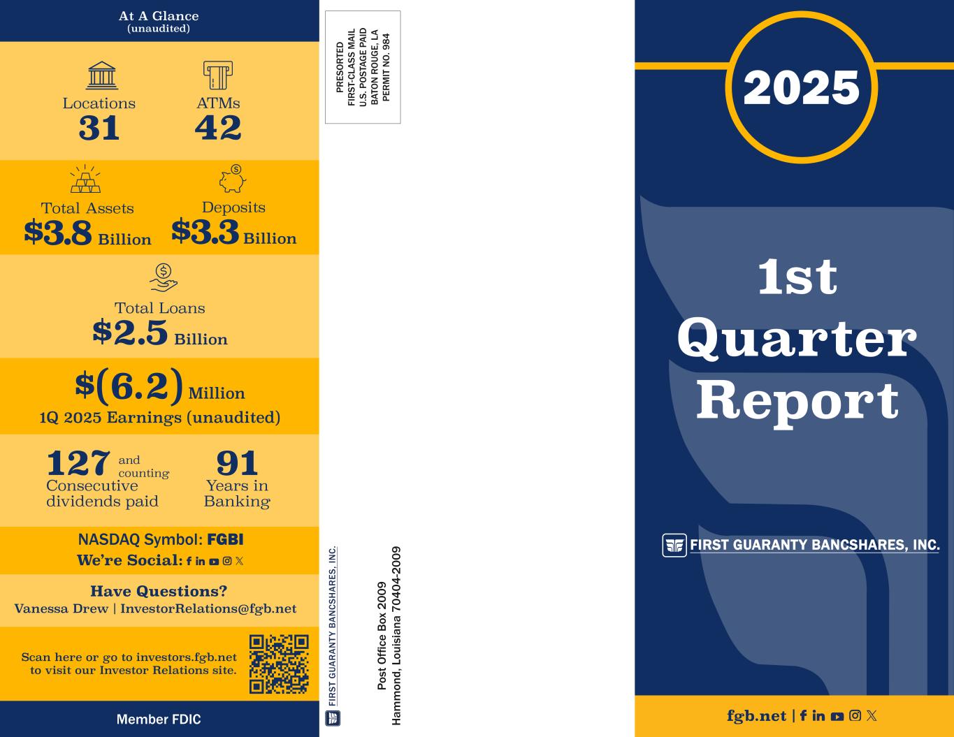 Total Assets $3.8 Billion Deposits $3.3 Billion Locations 31 ATMs 42 1Q 2025 Earnings (unaudited) 127 Consecutive dividends paid and counting 91 Years in Banking Total Loans $2.5 Billion Have Questions? Vanessa Drew | InvestorRelations@fgb.net NASDAQ Symbol: FGBI We’re Social: FI R ST G UA R A N TY B A N CS H A R ES , I N C. Po st O ffi ce B ox 2 00 9 H am m on d, L ou is ia na 7 04 04 -2 00 9 PR ES O R TE D FI R ST -C LA SS M A IL U. S. P O ST AG E PA ID B AT O N R O UG E, L A PE R M IT N O . 9 84 FIRST GUARANTY BANCSHARES, INC. 1st Quarter Report 2025 At A Glance (unaudited) Member FDIC fgb.net | $(6.2) Million Scan here or go to investors.fgb.net to visit our Investor Relations site.