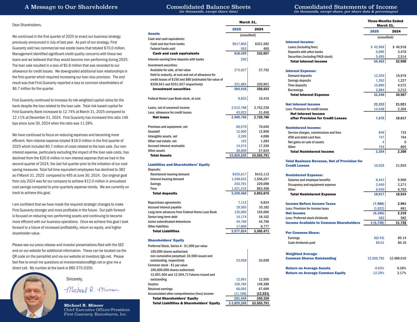Michael R. Mineer Chief Executive Officer/President First Guaranty Bancshares, Inc. A Message to Our Shareholders Consolidated Balance Sheets (in thousands, except share data) Consolidated Statements of Income (in thousands, except share, per share data & percentages) Assets Cash and cash equivalents: Cash and due from banks $617,866 $331,592 Federal funds sold 563 465 Cash and cash equivalents 618,429 332,057 Interest-earning time deposits with banks 250 - Investment securities: Available for sale, at fair value 273,027 37,752 Held to maturity, at cost and net of allowance for credit losses of $150 and $80 (estimated fair value of $259,641 and $251,627 respectively) 321,883 320,901 Investment securities 594,910 358,653 Federal Home Loan Bank stock, at cost 9,835 10,410 Loans, net of unearned income 2,512,788 2,752,230 Less: allowance for credit losses 43,022 31,450 Net loans 2,469,766 2,720,780 Premises and equipment, net 66,579 70,646 Goodwill 12,900 12,900 Intangible assets, net 3,265 4,088 Other real estate, net 152 1,284 Accrued interest receivable 14,574 17,339 Other assets 38,609 27,634 Total Assets $3,829,269 $3,555,791 Liabilities and Shareholders’ Equity Deposits: Noninterest-bearing demand $425,617 $415,113 Interest-bearing demand 1,248,633 1,556,257 Savings 243,701 229,098 Time 1,421,515 863,408 Total deposits 3,339,466 3,063,876 Repurchase agreements 7,113 6,834 Accrued interest payable 19,505 10,182 Long-term advances from Federal Home Loan Bank 135,000 155,000 Senior long-term debt 14,174 18,102 Junior subordinated debentures 44,760 44,700 Other liabilities 17,806 6,777 Total Liabilities 3,577,824 3,305,471 Shareholders’ Equity Preferred Stock, Series A - $1,000 par value 100,000 shares authorized; non-cumulative perpetual; 34,500 issued and outstanding, respectively 33,058 33,058 Common stock - $1 par value 100,600,000 shares authorized; 12,691,504 and 12,504,717shares issued and outstanding 12,691 12,505 Surplus 150,784 149,389 Retained earnings 66,092 67,699 Accumulated other comprehensive (loss) income (11,180) (12,331) Total Shareholders’ Equity 251,445 250,320 Total Liabilities & Shareholders’ Equity $ 3,829,269 $3,555,791 March 31, 2025 2024 (unaudited) Three-Months Ended March 31, 2025 2024 (unaudited) Interest Income: Loans (including fees) $ 42,969 $ 46,918 Deposits with other banks 5,999 3,476 Securities (including FHLB stock) 5,495 2,514 Total Interest Income 54,463 52,908 Interest Expense: Demand deposits 12,204 16,976 Savings deposits 1,262 1,227 Time deposits 15,890 9,572 Borrowings 2,884 3,212 Total Interest Expense 32,240 30,987 Net Interest Income 22,223 21,921 Less: Provision for credit losses 14,548 2,304 Net Interest Income after Provision for Credit Losses 7,675 19,617 Noninterest Income: Service charges, commissions and fees 849 733 ATM and debit card fees 747 764 Net gains on sale of assets 4 6 Other 754 805 Total Noninterest Income 2,354 2,308 Total Business Revenue, Net of Provision for Credit Losses 10,029 21,925 Noninterest Expense: Salaries and employee benefits 8,441 9,900 Occupancy and equipment expense 2,640 2,271 Other 6,936 6,763 Total Noninterest Expense 18,017 18,934 Income Before Income Taxes (7,988) 2,991 Less: Provision for income taxes (1,822) 681 Net Income (6,166) 2,310 Less: Preferred stock dividends 582 582 Income Available to Common Shareholders $ (6,748) $1,728 Per Common Share: Earnings $(0.54) $0.14 Cash dividends paid $0.01 $0.16 Weighted Average Common Shares Outstanding 12,506,792 12,489,910 Return on Average Assets -0.63% 0.26% Return on Average Common Equity -12.29% 3.17% Dear Shareholders, We continued in the first quarter of 2025 to enact our business strategy previously announced in July of last year. As part of our strategy, First Guaranty sold two commercial real estate loans that totaled $70.0 million. Management identified significant credit quality concerns with these two loans and we believed that they would become non-performing during 2025. The loan sale resulted in a loss of $5.8 million that was recorded to our allowance for credit losses. We downgraded additional loan relationships in the first quarter which required increasing our loan loss provision. The end result was that First Guaranty reported a loss to common shareholders of $6.7 million for the quarter. First Guaranty continued to increase its risk weighted capital ratios for the bank despite the loss related to the loan sale. Total risk based capital for First Guaranty Bank increased to 12.74% at March 31, 2025 compared to 12.11% at December 31, 2024. First Guaranty has increased this ratio 146 bps since June 30, 2024 when the ratio was 11.28%. We have continued to focus on reducing expenses and becoming more efficient. Non-interest expense totaled $18.0 million in the first quarter of 2025 which included $0.7 million of costs related to the loan sale. Our non- interest expense, particularly excluding the impact of the loan sale costs, has declined from the $20.6 million in non-interest expense that we had in the second quarter of 2024, the last full quarter prior to the initiation of our cost saving measures. Total full time equivalent employees has declined to 382 as if March 31, 2025 compared to 495 at June 30, 2024. Our original goal from July 2024 was for our company to achieve $12.0 million in annualized cost savings compared to prior quarterly expense trends. We are currently on track to achieve this goal. I am confident that we have made the required strategic changes to make First Guaranty stronger and more profitable in the future. Our path forward is focused on reducing non-performing assets and continuing to become more efficient with our business operations. Once we achieve this goal I look forward to a future of increased profitability, return on equity, and higher shareholder value. Please see our press release and investor presentations filed with the SEC and on our website for additional information. These can be located vi
