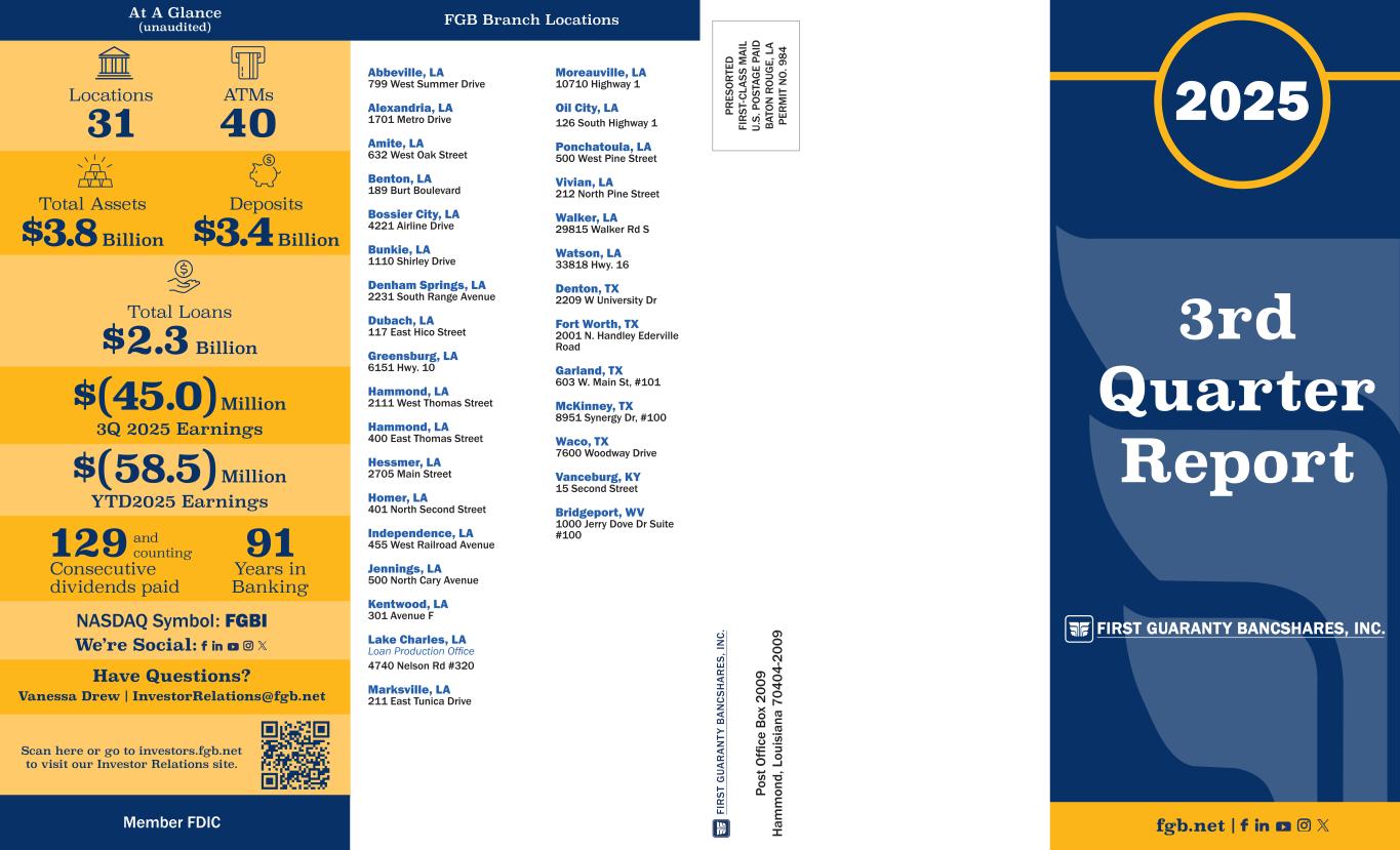 PR ES O R TE D FI R ST -C LA SS M A IL U. S. P O ST AG E PA ID B AT O N R O UG E, L A PE R M IT N O . 9 84 Total Assets $3.8 Billion Deposits $3.4 Billion Locations 31 ATMs 40 $(45.0) Million 3Q 2025 Earnings $(58.5) Million YTD2025 Earnings 129 Consecutive dividends paid and counting 91 Years in Banking Total Loans $2.3 Billion Member FDIC FIRST GUARANTY BANCSHARES, INC. 3rd Quarter Report 2025 fgb.net | FI R ST G UA R A N TY B A N CS H A R ES , I N C. Po st O ffi ce B ox 2 00 9 H am m on d, L ou is ia na 7 04 04 -2 00 9 NASDAQ Symbol: FGBI We’re Social: Scan here or go to investors.fgb.net to visit our Investor Relations site. Have Questions? Vanessa Drew | InvestorRelations@fgb.net At A Glance (unaudited) FGB Branch Locations Abbeville, LA 799 West Summer Drive Alexandria, LA 1701 Metro Drive Amite, LA 632 West Oak Street Benton, LA 189 Burt Boulevard Bossier City, LA 4221 Airline Drive Bunkie, LA 1110 Shirley Drive Denham Springs, LA 2231 South Range Avenue Dubach, LA 117 East Hico Street Greensburg, LA 6151 Hwy. 10 Hammond, LA 2111 West Thomas Street Hammond, LA 400 East Thomas Street Hessmer, LA 2705 Main Street Homer, LA 401 North Second Street Independence, LA 455 West Railroad Avenue Jennings, LA 500 North Cary Avenue Kentwood, LA 301 Avenue F Lake Charles, LA Loan Production Office 4740 Nelson Rd #320 Marksville, LA 211 East Tunica Drive Moreauville, LA 10710 Highway 1 Oil City, LA 126 South Highway 1 Ponchatoula, LA 500 West Pine Street Vivian, LA 212 North Pine Street Walker, LA 29815 Walker Rd S Watson, LA 33818 Hwy. 16 Denton, TX 2209 W University Dr Fort Worth, TX 2001 N. Handley Ederville Road Garland, TX 603 W. Main St, #101 McKinney, TX 8951 Synergy Dr, #100 Waco, TX 7600 Woodway Drive Vanceburg, KY 15 Second Street Bridgeport, WV 1000 Jerry Dove Dr Suite #100