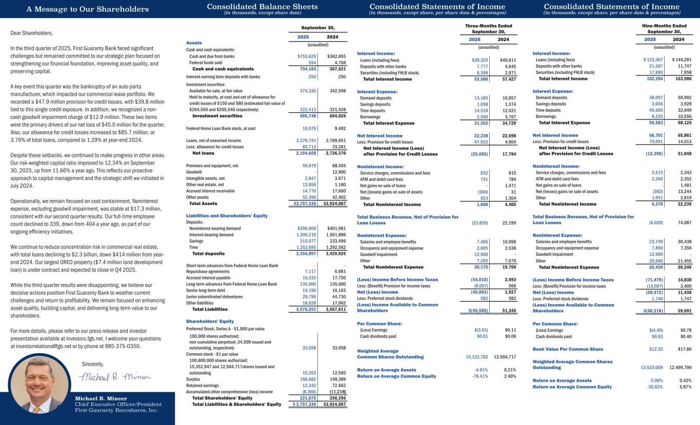 A Message to Our Shareholders Consolidated Balance Sheets (in thousands, except share data) Consolidated Statements of Income (in thousands, except share, per share data & percentages) Consolidated Statements of Income (in thousands, except share, per share data & percentages) Nine-Months Ended September 30, 2025 2024 (unaudited) Interest Income: Loans (including fees) $ 123,307 $ 144,281 Deposits with other banks 21,287 11,747 Securities (including FHLB stock) 17,690 7,958 Total Interest Income 162,284 163,986 Interest Expense: Demand deposits 38,097 50,992 Savings deposits 3,656 3,928 Time deposits 45,605 32,649 Borrowings 8,225 10,556 Total Interest Expense 95,583 98,125 Net Interest Income 66,701 65,861 Less: Provision for credit losses 79,091 14,013 Net Interest Income (Loss) after Provision for Credit Losses (12,390) 51,848 Noninterest Income: Service charges, commissions and fees 2,515 2,343 ATM and debit card fees 2,266 2,352 Net gains on sale of loans - 1,481 Net (losses) gains on sale of assets (362) 13,244 Other 1,951 2,819 Total Noninterest Income 6,370 22,239 Total Business Revenue, Net of Provision for Loan Losses (6,020) 74,087 Noninterest Expense: Salaries and employee benefits 23,749 30,438 Occupancy and equipment expense 7,850 7,356 Goodwill Impairment 12,900 - Other 20,960 21,455 Total Noninterest Expense 65,459 59,249 (Loss) Income Before Income Taxes (71,479) 14,838 Less: (Benefit) Provision for income taxes (13,007) 3,400 Net (Loss) Income (58,472) 11,438 Less: Preferred stock dividends 1,746 1,747 (Loss) Income Available to Common Shareholders $(60,218) $9,691 Per Common Share: (Loss) Earnings $(4.45) $0.78 Cash dividends paid $0.03 $0.40 Book Value Per Common Share $12.25 $17.86 Weighted Average Common Shares Outstanding 13,523,009 12,499,799 Return on Average Assets -2.00% 0.42% Return on Average Common Equity -35.83% 5.87% Three-Months Ended September 30, 2025 2024 (unaudited) Interest Income: Loans (including fees) $39,325 $49,811 Deposits with other banks 7,777 4,645 Securities (including FHLB stock) 6,398 2,971 Total Interest Income 53,500 57,427 Interest Expense: Demand deposits 13,185 16,957 Savings deposits 1,058 1,374 Time deposits 14,519 12,631 Borrowings 2,500 3,767 Total Interest Expense 31,262 34,729 Net Interest Income 22,238 22,698 Less: Provision for credit losses 47,933 4,904 Net Interest Income (Loss) after Provision for Credit Losses (25,695) 17,794 Noninterest Income: Service charges, commissions and fees 832 815 ATM and debit card fees 741 784 Net gains on sale of loans - 1,471 Net (losses) gains on sale of assets (366) 31 Other 653 1,304 Total Noninterest Income 1,860 4,405 Total Business Revenue, Net of Provision for Loan Losses (23,835) 22,199 Noninterest Expense: Salaries and employee benefits 7,465 10,098 Occupancy and equipment expense 2,605 2,538 Goodwill Impairment 12,900 - Other 7,205 7,070 Total Noninterest Expense 30,175 19,706 (Loss) Income Before Income Taxes (54,010) 2,493 Less: (Benefit) Provision for income taxes (9,007) 566 Net (Loss) Income (45,003) 1,927 Less: Preferred stock dividends 582 582 (Loss) Income Available to Common Shareholders $(45,585) $1,345 Per Common Share: (Loss) Earnings $(3.01) $0.11 Cash dividends paid $0.01 $0.08 Weighted Average Common Shares Outstanding 15,122,702 12,504,717 Return on Average Assets -4.61% 0.21% Return on Average Common Equity -78.41% 2.40% Michael R. Mineer Chief Executive Officer/President First Guaranty Bancshares, Inc. Dear Shareholders, In the third quarter of 2025, First Guaranty Bank faced significant challenges but remained committed to our strategic plan focused on strengthening our financial foundation, improving asset quality, and preserving capital. A key event this quarter was the bankruptcy of an auto parts manufacturer, which impacted our commercial lease portfolio. We recorded a $47.9 million provision for credit losses, with $39.8 million tied to this single credit exposure. In addition, we recognized a non- cash goodwill impairment charge of $12.9 million. These two items were the primary drivers of our net loss of $45.0 million for the quarter. Also, our allowance for credit losses increased to $85.7 million, or 3.76% of total loans, compared to 1.29% at year-end 2024. Despite these setbacks, we continued to make progress in other areas. Our risk-weighted capital ratio improved to 12.34% on September 30, 2025, up from 11.66% a year ago. This reflects our proactive approach to capital management and the strategic shift we initiated in July 2024. Operationally, we remain focused on cost containment. Noninterest expense, excluding goodwill impairment, was stable at $17.3 million, consistent with our second quarter results. Our full-time employee count declined to 339, down from 404 a year ago, as part of our ongoing efficiency initiatives. We continue to reduce concentration risk in commercial real estate, with total loans declining to $2.3 billion, down $414 million from year- end 2024. Our largest OREO property ($7.4 million land development loan) is under contract and expected to close in Q4 2025. While the third quarter results were disappointing, we believe our decisive actions position First Guaranty Bank to weather current challenges and return to profitability. We remain focused on enhancing asset quality, building capital, and delivering long-term value to our shareholders. For more details, please refer to our press release and investor presentation available at investors.fgb.net. I welcome your questions at investorrelations@fgb.net or by phone at 985-375-0350. Sincerely, Assets Cash and cash equivalents: Cash and due from banks $753,629 $362,855 Federal funds sold 554 4,766 Cash and cash equivalents 754,183 367,621 Interest-earning time deposits with banks 250 250 Investment securities: Available for sale, at fair value 374,335 342,598 Held to maturity, at cost and net of allowance for credit losses of $150 and $80 (estimated fair value of $264,566 and $265