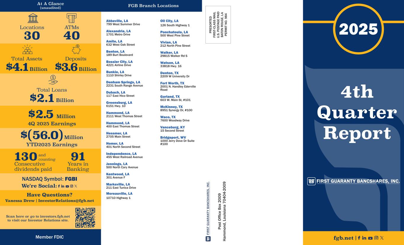 PR ES O R TE D FI R ST -C LA SS M A IL U. S. P O ST AG E PA ID B AT O N R O UG E, L A PE R M IT N O . 9 84 Total Assets $4.1 Billion Deposits $3.6 Billion Locations 30 ATMs 40 $2.5 Million 4Q 2025 Earnings $(56.0) Million YTD2025 Earnings 130 Consecutive dividends paid and counting 91 Years in Banking Total Loans $2.1 Billion Member FDIC FIRST GUARANTY BANCSHARES, INC. 4th Quarter Report 2025 fgb.net | FI R ST G UA R A N TY B A N CS H A R ES , I N C. Po st O ffi ce B ox 2 00 9 H am m on d, L ou is ia na 7 04 04 -2 00 9 NASDAQ Symbol: FGBI We’re Social: Scan here or go to investors.fgb.net to visit our Investor Relations site. Have Questions? Vanessa Drew | InvestorRelations@fgb.net At A Glance (unaudited) FGB Branch Locations Abbeville, LA 799 West Summer Drive Alexandria, LA 1701 Metro Drive Amite, LA 632 West Oak Street Benton, LA 189 Burt Boulevard Bossier City, LA 4221 Airline Drive Bunkie, LA 1110 Shirley Drive Denham Springs, LA 2231 South Range Avenue Dubach, LA 117 East Hico Street Greensburg, LA 6151 Hwy. 10 Hammond, LA 2111 West Thomas Street Hammond, LA 400 East Thomas Street Hessmer, LA 2705 Main Street Homer, LA 401 North Second Street Independence, LA 455 West Railroad Avenue Jennings, LA 500 North Cary Avenue Kentwood, LA 301 Avenue F Marksville, LA 211 East Tunica Drive Moreauville, LA 10710 Highway 1 Oil City, LA 126 South Highway 1 Ponchatoula, LA 500 West Pine Street Vivian, LA 212 North Pine Street Walker, LA 29815 Walker Rd S Watson, LA 33818 Hwy. 16 Denton, TX 2209 W University Dr Fort Worth, TX 2001 N. Handley Ederville Road Garland, TX 603 W. Main St, #101 McKinney, TX 8951 Synergy Dr, #100 Waco, TX 7600 Woodway Drive Vanceburg, KY 15 Second Street Bridgeport, WV 1000 Jerry Dove Dr Suite #100