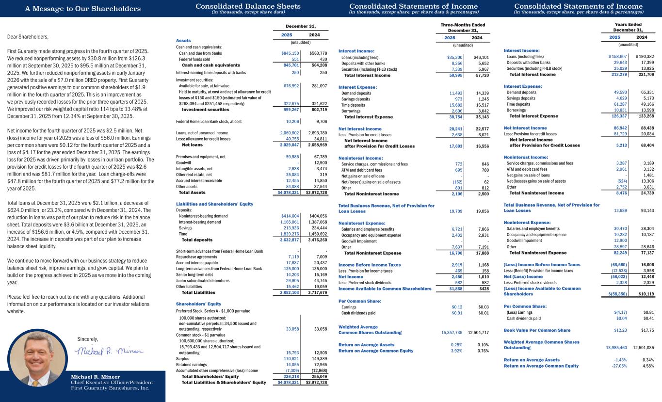 A Message to Our Shareholders Consolidated Balance Sheets (in thousands, except share data) Consolidated Statements of Income (in thousands, except share, per share data & percentages) Consolidated Statements of Income (in thousands, except share, per share data & percentages) Years Ended December 31, 2025 2024 (unaudited) Interest Income: Loans (including fees) $ 158,607 $ 190,382 Deposits with other banks 29,643 17,399 Securities (including FHLB stock) 25,029 13,925 Total Interest Income 213,279 221,706 Interest Expense: Demand deposits 49,590 65,331 Savings deposits 4,629 5,173 Time deposits 61,287 49,166 Borrowings 10,831 13,598 Total Interest Expense 126,337 133,268 Net Interest Income 86,942 88,438 Less: Provision for credit losses 81,729 20,034 Net Interest Income after Provision for Credit Losses 5,213 68,404 Noninterest Income: Service charges, commissions and fees 3,287 3,189 ATM and debit card fees 2,961 3,132 Net gains on sale of loans - 1,481 Net (losses) gains on sale of assets (524) 13,306 Other 2,752 3,631 Total Noninterest Income 8,476 24,739 Total Business Revenue, Net of Provision for Loan Losses 13,689 93,143 Noninterest Expense: Salaries and employee benefits 30,470 38,304 Occupancy and equipment expense 10,282 10,187 Goodwill Impairment 12,900 - Other 28,597 28,646 Total Noninterest Expense 82,249 77,137 (Loss) Income Before Income Taxes (68,560) 16,006 Less: (Benefit) Provision for income taxes (12,538) 3,558 Net (Loss) Income (56,022) 12,448 Less: Preferred stock dividends 2,328 2,329 (Loss) Income Available to Common Shareholders $(58,350) $10,119 Per Common Share: (Loss) Earnings $(4.17) $0.81 Cash dividends paid $0.04 $0.41 Book Value Per Common Share $12.23 $17.75 Weighted Average Common Shares Outstanding 13,985,460 12,501,035 Return on Average Assets -1.43% 0.34% Return on Average Common Equity -27.05% 4.58% Three-Months Ended December 31, 2025 2024 (unaudited) Interest Income: Loans (including fees) $35,300 $46,101 Deposits with other banks 8,356 5,652 Securities (including FHLB stock) 7,339 5,967 Total Interest Income 50,995 57,720 Interest Expense: Demand deposits 11,493 14,339 Savings deposits 973 1,245 Time deposits 15,682 16,517 Borrowings 2,606 3,042 Total Interest Expense 30,754 35,143 Net Interest Income 20,241 22,577 Less: Provision for credit losses 2,638 6,021 Net Interest Income after Provision for Credit Losses 17,603 16,556 Noninterest Income: Service charges, commissions and fees 772 846 ATM and debit card fees 695 780 Net gains on sale of loans - - Net (losses) gains on sale of assets (162) 62 Other 801 812 Total Noninterest Income 2,106 2,500 Total Business Revenue, Net of Provision for Loan Losses 19,709 19,056 Noninterest Expense: Salaries and employee benefits 6,721 7,866 Occupancy and equipment expense 2,432 2,831 Goodwill Impairment - - Other 7,637 7,191 Total Noninterest Expense 16,790 17,888 Income Before Income Taxes 2,919 1,168 Less: Provision for income taxes 469 158 Net Income 2,450 1,010 Less: Preferred stock dividends 582 582 Income Available to Common Shareholders $1,868 $428 Per Common Share: Earnings $0.12 $0.03 Cash dividends paid $0.01 $0.01 Weighted Average Common Shares Outstanding 15,357,735 12,504,717 Return on Average Assets 0.25% 0.10% Return on Average Common Equity 3.92% 0.76% Michael R. Mineer Chief Executive Officer/President First Guaranty Bancshares, Inc. Sincerely, Assets Cash and cash equivalents: Cash and due from banks $845,150 $563,778 Federal funds sold 551 430 Cash and cash equivalents 845,701 564,208 Interest-earning time deposits with banks 250 250 Investment securities: Available for sale, at fair value 676,592 281,097 Held to maturity, at cost and net of allowance for credit losses of $150 and $150 (estimated fair value of $268,094 and $251,458 respectively) 322,675 321,622 Investment securities 999,267 602,719 Federal Home Loan Bank stock, at cost 10,206 9,706 Loans, net of unearned income 2,069,802 2,693,780 Less: allowance for credit losses 40,755 34,811 Net loans 2,029,047 2,658,969 Premises and equipment, net 59,585 67,789 Goodwill - 12,900 Intangible assets, net 2,638 3,474 Other real estate, net 35,084 319 Accrued interest receivable 12,455 14,850 Other assets 84,088 37,544 Total Assets $4,078,321 $3,972,728 Liabilities and Shareholders’ Equity Deposits: Noninterest-bearing demand $414,604 $404,056 Interest-bearing demand 1,165,061 1,387,068 Savings 213,936 234,444 Time 1,839,276 1,450,692 Total deposits 3,632,877 3,476,260 Short-term advances from Federal Home Loan Bank Repurchase agreements - 7,119 - 7,009 Accrued interest payable 17,637 20,437 Long-term advances from Federal Home Loan Bank 135,000 135,000 Senior long-term debt 14,203 15,169 Junior subordinated debentures 29,805 44,745 Other liabilities 15,462 19,059 Total Liabilities 3,852,103 3,717,679 Shareholders’ Equity Preferred Stock, Series A - $1,000 par value 100,000 shares authorized; non-cumulative perpetual; 34,500 issued and outstanding, respectively 33,058 33,058 Common stock - $1 par value 100,600,000 shares authorized; 15,793,433 and 12,504,717 shares issued and outstanding 15,793 12,505 Surplus 170,621 149,389 Retained earnings 14,055 72,965 Accumulated other comprehensive (loss) income (7,309) (12,868) Total Shareholders’ Equity 226,218 255,049 Total Liabilities & Shareholders’ Equity $4,078,321 $3,972,728 December 31, 2025 2024 (unaudited) Dear Shareholders, First Guaranty made strong progress in the fourth quarter of 2025. We reduced nonperforming assets by $30.8 million from $126.3 million at September 30, 2025 to $95.5 million at December 31, 2025. We further reduced nonperforming assets in early January 2026 with the sale of a $7.0 million OREO property. First Guaranty generated positive earnings to our common shareholders of $1.9 million in the fourth quarter of 2025. This is an improvement as we previously recorded losses for the prior three quarters of 2025. We improved our risk weighted capital ratio 114 b