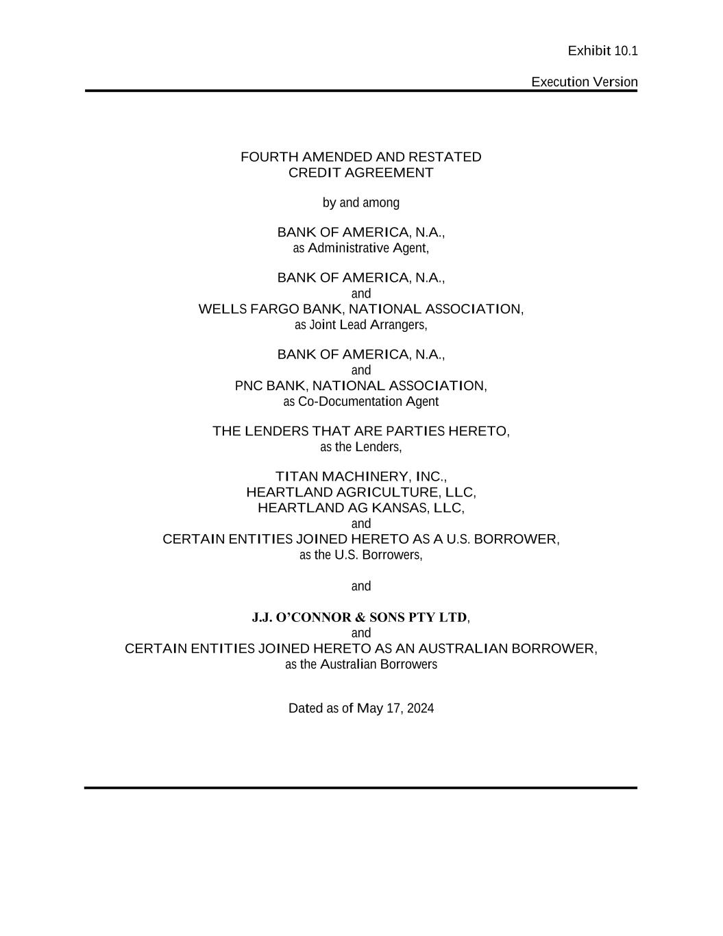 Exhibit 10.1 Execution Version FOURTH AMENDED AND RESTATED CREDIT AGREEMENT by and among BANK OF AMERICA, N.A., as Administrative Agent, BANK OF AMERICA, N.A., and WELLS FARGO BANK, NATIONAL ASSOCIATION, as Joint Lead Arrangers, BANK OF AMERICA, N.A., and PNC BANK, NATIONAL ASSOCIATION, as Co-Documentation Agent THE LENDERS THAT ARE PARTIES HERETO, as the Lenders, TITAN MACHINERY, INC., HEARTLAND AGRICULTURE, LLC, HEARTLAND AG KANSAS, LLC, and CERTAIN ENTITIES JOINED HERETO AS A U.S. BORROWER, as the U.S. Borrowers, and J.J. O’CONNOR & SONS PTY LTD, and CERTAIN ENTITIES JOINED HERETO AS AN AUSTRALIAN BORROWER, as the Australian Borrowers Dated as of May 17, 2024
