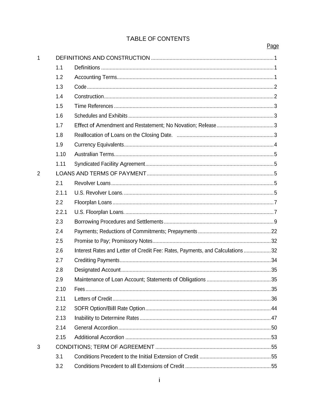 TABLE OF CONTENTS Page i 1 DEFINITIONS AND CONSTRUCTION ...................................................................................... 1 1.1 Definitions ......................................................................................................................... 1 1.2 Accounting Terms .............................................................................................................. 1 1.3 Code ................................................................................................................................... 2 1.4 Construction ....................................................................................................................... 2 1.5 Time References ................................................................................................................ 3 1.6 Schedules and Exhibits ...................................................................................................... 3 1.7 Effect of Amendment and Restatement; No Novation; Release ........................................ 3 1.8 Reallocation of Loans on the Closing Date. .................................................................... 3 1.9 Currency Equivalents ......................................................................................................... 4 1.10 Australian Terms. ............................................................................................................... 5 1.11 Syndicated Facility Agreement .......................................................................................... 5 2 LOANS AND TERMS OF PAYMENT ......................................................................................... 5 2.1 Revolver Loans .................................................................................................................. 5 2.1.1 U.S. Revolver Loans. ......................................................................................................... 5 2.2 Floorplan Loans ................................................................................................................. 7 2.2.1 U.S. Floorplan Loans. ........................................................................................................ 7 2.3 Borrowing Procedures and Settlements ............................................................................. 9 2.4 Payments; Reductions of Commitments; Prepayments ................................................... 22 2.5 Promise to Pay; Promissory Notes ................................................................................... 32 2.6 Interest Rates and Letter of Credit Fee: Rates, Payments, and Calculations ................... 32 2.7 Crediting Payments .......................................................................................................... 34 2.8 Designated Account ......................................................................................................... 35 2.9 Maintenance of Loan Account; Statements of Obligations ............................................. 35 2.10 Fees .................................................................................................................................. 35 2.11 Letters of Credit ............................................................................................................... 36 2.12 SOFR Option/Bill Rate Option ........................................................................................ 44 2.13 Inability to Determine Rates ............................................................................................ 47 2.14 General Accordion ........................................................................................................... 50 2.15 Additional Accordion ...................................................................................................... 53 3 CONDITIONS; TERM OF AGREEMENT ................................................................................. 55 3.1 Conditions Precedent to the Initial Extension of Credit .................................................. 55 3.2 Conditions Precedent to all Extensions of Credit ............................................................ 55
