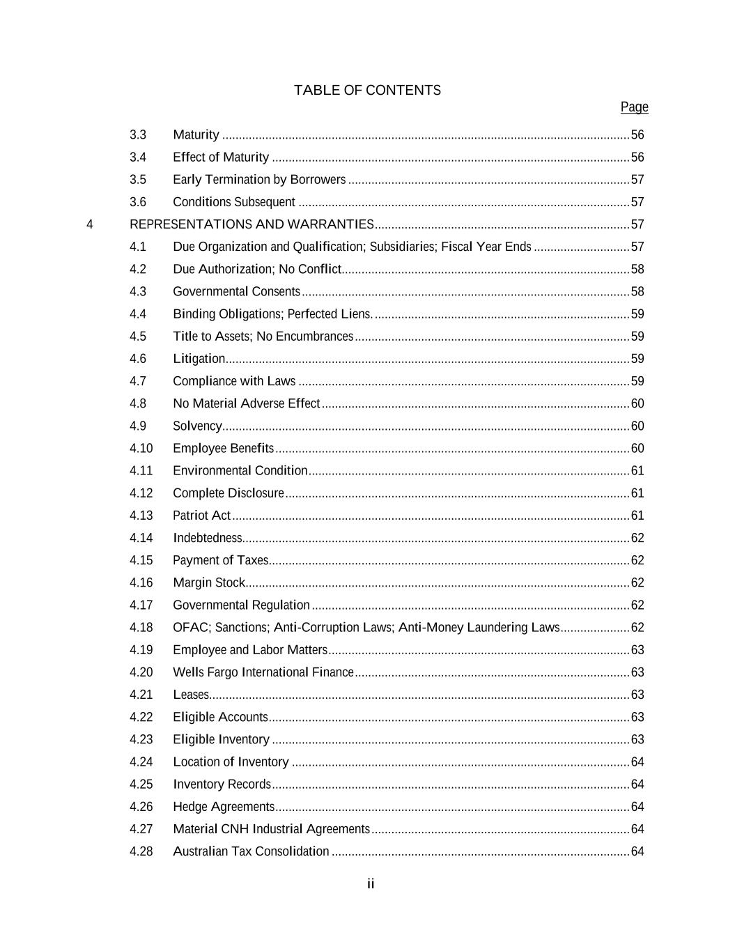 TABLE OF CONTENTS Page ii 3.3 Maturity ........................................................................................................................... 56 3.4 Effect of Maturity ............................................................................................................ 56 3.5 Early Termination by Borrowers ..................................................................................... 57 3.6 Conditions Subsequent .................................................................................................... 57 4 REPRESENTATIONS AND WARRANTIES ............................................................................. 57 4.1 Due Organization and Qualification; Subsidiaries; Fiscal Year Ends ............................. 57 4.2 Due Authorization; No Conflict....................................................................................... 58 4.3 Governmental Consents ................................................................................................... 58 4.4 Binding Obligations; Perfected Liens. ............................................................................. 59 4.5 Title to Assets; No Encumbrances ................................................................................... 59 4.6 Litigation .......................................................................................................................... 59 4.7 Compliance with Laws .................................................................................................... 59 4.8 No Material Adverse Effect ............................................................................................. 60 4.9 Solvency........................................................................................................................... 60 4.10 Employee Benefits ........................................................................................................... 60 4.11 Environmental Condition ................................................................................................. 61 4.12 Complete Disclosure ........................................................................................................ 61 4.13 Patriot Act ........................................................................................................................ 61 4.14 Indebtedness..................................................................................................................... 62 4.15 Payment of Taxes ............................................................................................................. 62 4.16 Margin Stock.................................................................................................................... 62 4.17 Governmental Regulation ................................................................................................ 62 4.18 OFAC; Sanctions; Anti-Corruption Laws; Anti-Money Laundering Laws ..................... 62 4.19 Employee and Labor Matters ........................................................................................... 63 4.20 Wells Fargo International Finance ................................................................................... 63 4.21 Leases............................................................................................................................... 63 4.22 Eligible Accounts ............................................................................................................. 63 4.23 Eligible Inventory ............................................................................................................ 63 4.24 Location of Inventory ...................................................................................................... 64 4.25 Inventory Records ............................................................................................................ 64 4.26 Hedge Agreements ........................................................................................................... 64 4.27 Material CNH Industrial Agreements .............................................................................. 64 4.28 Australian Tax Consolidation .......................................................................................... 64