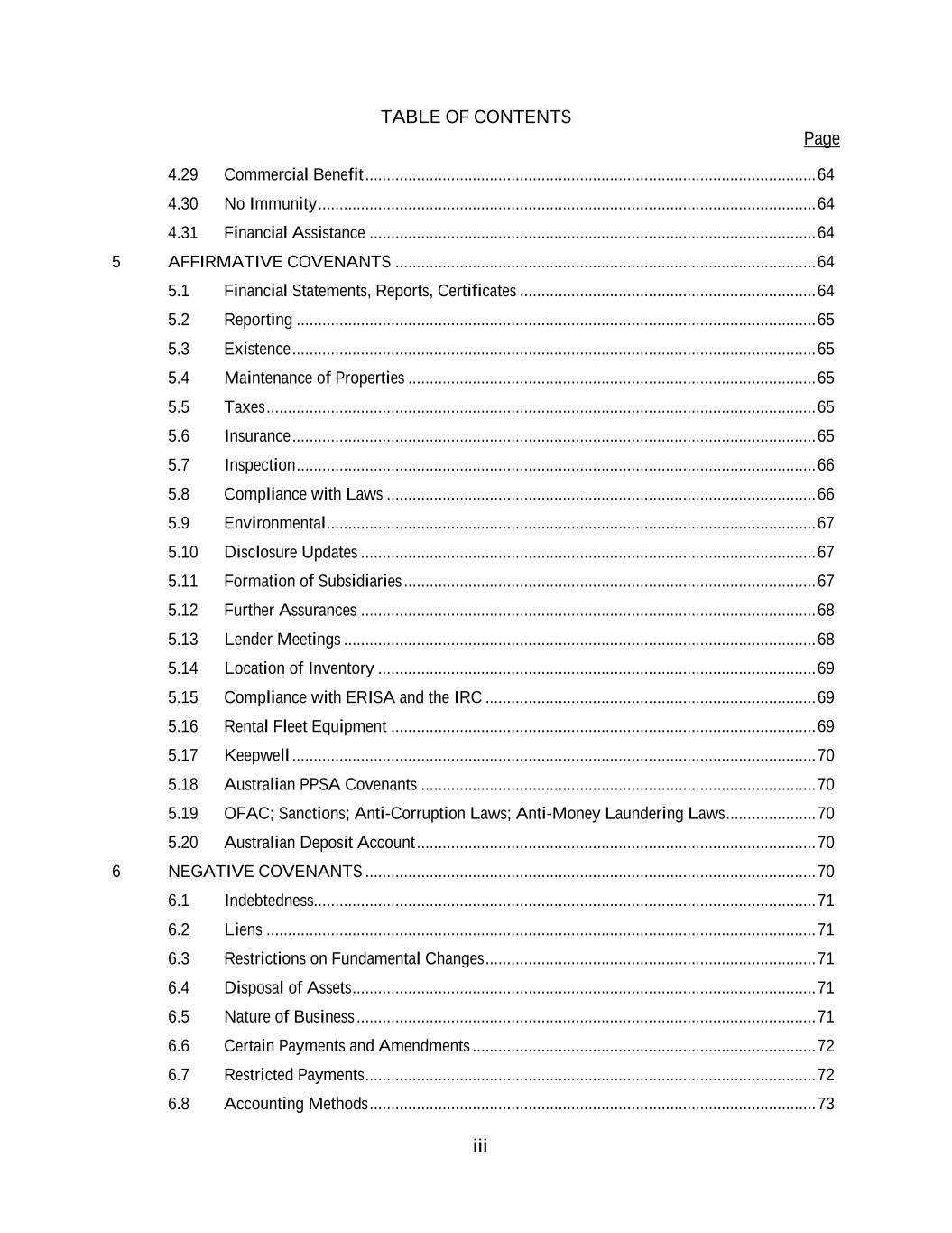 TABLE OF CONTENTS Page iii 4.29 Commercial Benefit ......................................................................................................... 64 4.30 No Immunity .................................................................................................................... 64 4.31 Financial Assistance ........................................................................................................ 64 5 AFFIRMATIVE COVENANTS .................................................................................................. 64 5.1 Financial Statements, Reports, Certificates ..................................................................... 64 5.2 Reporting ......................................................................................................................... 65 5.3 Existence .......................................................................................................................... 65 5.4 Maintenance of Properties ............................................................................................... 65 5.5 Taxes ................................................................................................................................ 65 5.6 Insurance .......................................................................................................................... 65 5.7 Inspection ......................................................................................................................... 66 5.8 Compliance with Laws .................................................................................................... 66 5.9 Environmental .................................................................................................................. 67 5.10 Disclosure Updates .......................................................................................................... 67 5.11 Formation of Subsidiaries ................................................................................................ 67 5.12 Further Assurances .......................................................................................................... 68 5.13 Lender Meetings .............................................................................................................. 68 5.14 Location of Inventory ...................................................................................................... 69 5.15 Compliance with ERISA and the IRC ............................................................................. 69 5.16 Rental Fleet Equipment ................................................................................................... 69 5.17 Keepwell .......................................................................................................................... 70 5.18 Australian PPSA Covenants ............................................................................................ 70 5.19 OFAC; Sanctions; Anti-Corruption Laws; Anti-Money Laundering Laws ..................... 70 5.20 Australian Deposit Account ............................................................................................. 70 6 NEGATIVE COVENANTS ......................................................................................................... 70 6.1 Indebtedness..................................................................................................................... 71 6.2 Liens ................................................................................................................................ 71 6.3 Restrictions on Fundamental Changes ............................................................................. 71 6.4 Disposal of Assets ............................................................................................................ 71 6.5 Nature of Business ........................................................................................................... 71 6.6 Certain Payments and Amendments ................................................................................ 72 6.7 Restricted Payments ......................................................................................................... 72 6.8 Accounting Methods ........................................................................................................ 73