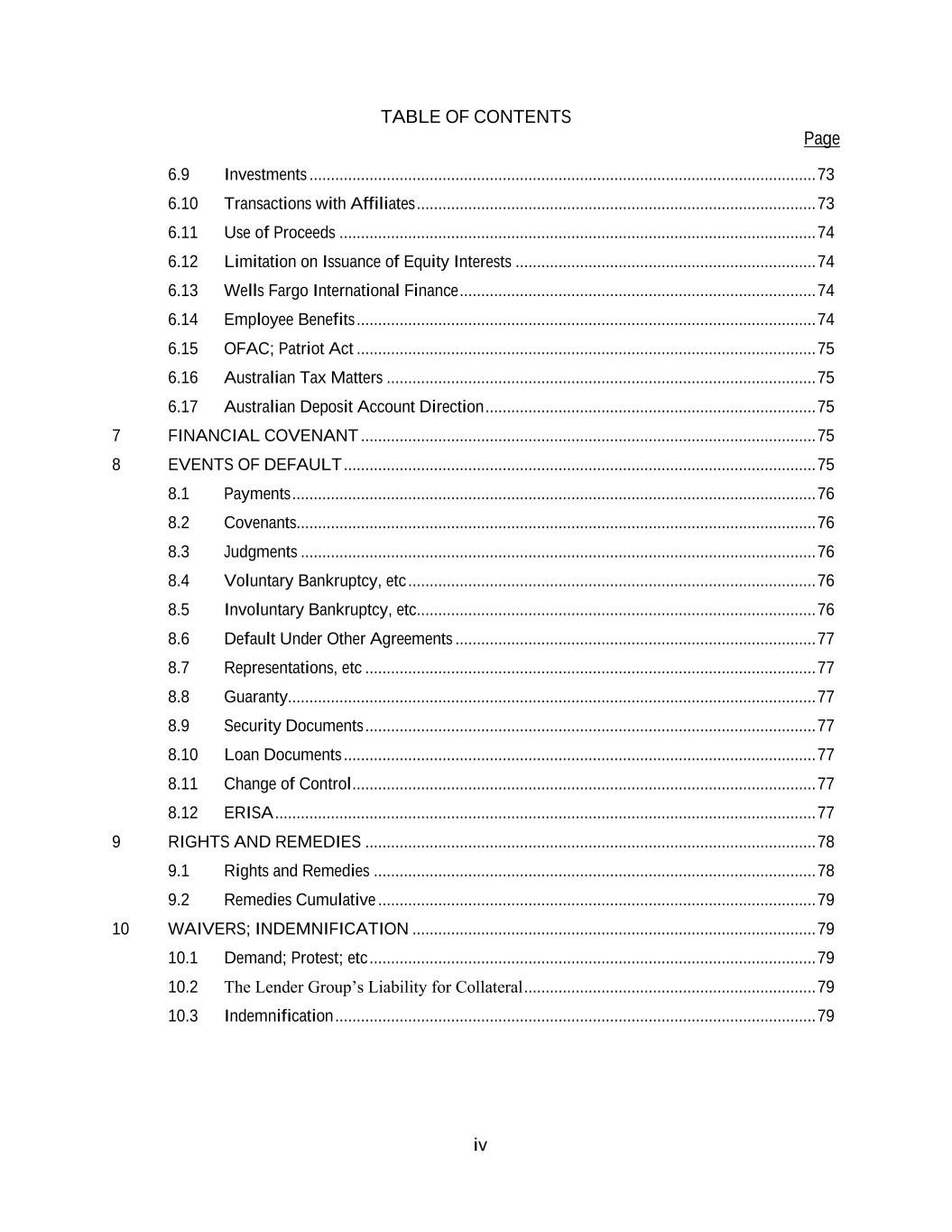 TABLE OF CONTENTS Page iv 6.9 Investments ...................................................................................................................... 73 6.10 Transactions with Affiliates ............................................................................................. 73 6.11 Use of Proceeds ............................................................................................................... 74 6.12 Limitation on Issuance of Equity Interests ...................................................................... 74 6.13 Wells Fargo International Finance ................................................................................... 74 6.14 Employee Benefits ........................................................................................................... 74 6.15 OFAC; Patriot Act ........................................................................................................... 75 6.16 Australian Tax Matters .................................................................................................... 75 6.17 Australian Deposit Account Direction ............................................................................. 75 7 FINANCIAL COVENANT .......................................................................................................... 75 8 EVENTS OF DEFAULT .............................................................................................................. 75 8.1 Payments .......................................................................................................................... 76 8.2 Covenants......................................................................................................................... 76 8.3 Judgments ........................................................................................................................ 76 8.4 Voluntary Bankruptcy, etc ............................................................................................... 76 8.5 Involuntary Bankruptcy, etc............................................................................................. 76 8.6 Default Under Other Agreements .................................................................................... 77 8.7 Representations, etc ......................................................................................................... 77 8.8 Guaranty........................................................................................................................... 77 8.9 Security Documents ......................................................................................................... 77 8.10 Loan Documents .............................................................................................................. 77 8.11 Change of Control ............................................................................................................ 77 8.12 ERISA .............................................................................................................................. 77 9 RIGHTS AND REMEDIES ......................................................................................................... 78 9.1 Rights and Remedies ....................................................................................................... 78 9.2 Remedies Cumulative ...................................................................................................... 79 10 WAIVERS; INDEMNIFICATION .............................................................................................. 79 10.1 Demand; Protest; etc ........................................................................................................ 79 10.2 The Lender Group’s Liability for Collateral .................................................................... 79 10.3 Indemnification ................................................................................................................ 79