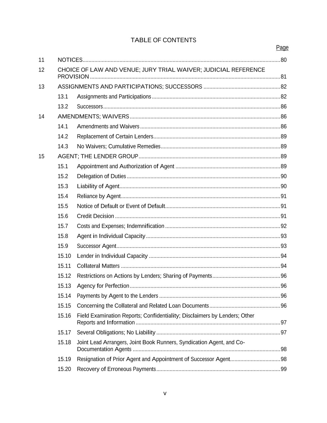 TABLE OF CONTENTS Page v 11 NOTICES ...................................................................................................................................... 80 12 CHOICE OF LAW AND VENUE; JURY TRIAL WAIVER; JUDICIAL REFERENCE PROVISION ................................................................................................................................. 81 13 ASSIGNMENTS AND PARTICIPATIONS; SUCCESSORS .................................................... 82 13.1 Assignments and Participations ....................................................................................... 82 13.2 Successors ........................................................................................................................ 86 14 AMENDMENTS; WAIVERS ...................................................................................................... 86 14.1 Amendments and Waivers ............................................................................................... 86 14.2 Replacement of Certain Lenders ...................................................................................... 89 14.3 No Waivers; Cumulative Remedies ................................................................................. 89 15 AGENT; THE LENDER GROUP ................................................................................................ 89 15.1 Appointment and Authorization of Agent ....................................................................... 89 15.2 Delegation of Duties ........................................................................................................ 90 15.3 Liability of Agent ............................................................................................................. 90 15.4 Reliance by Agent ............................................................................................................ 91 15.5 Notice of Default or Event of Default .............................................................................. 91 15.6 Credit Decision ................................................................................................................ 91 15.7 Costs and Expenses; Indemnification .............................................................................. 92 15.8 Agent in Individual Capacity ........................................................................................... 93 15.9 Successor Agent ............................................................................................................... 93 15.10 Lender in Individual Capacity ......................................................................................... 94 15.11 Collateral Matters ............................................................................................................ 94 15.12 Restrictions on Actions by Lenders; Sharing of Payments .............................................. 96 15.13 Agency for Perfection ...................................................................................................... 96 15.14 Payments by Agent to the Lenders .................................................................................. 96 15.15 Concerning the Collateral and Related Loan Documents ................................................ 96 15.16 Field Examination Reports; Confidentiality; Disclaimers by Lenders; Other Reports and Information .................................................................................................. 97 15.17 Several Obligations; No Liability .................................................................................... 97 15.18 Joint Lead Arrangers, Joint Book Runners, Syndication Agent, and Co- Documentation Agents .................................................................................................... 98 15.19 Resignation of Prior Agent and Appointment of Successor Agent.................................. 98 15.20 Recovery of Erroneous Payments .................................................................................... 99