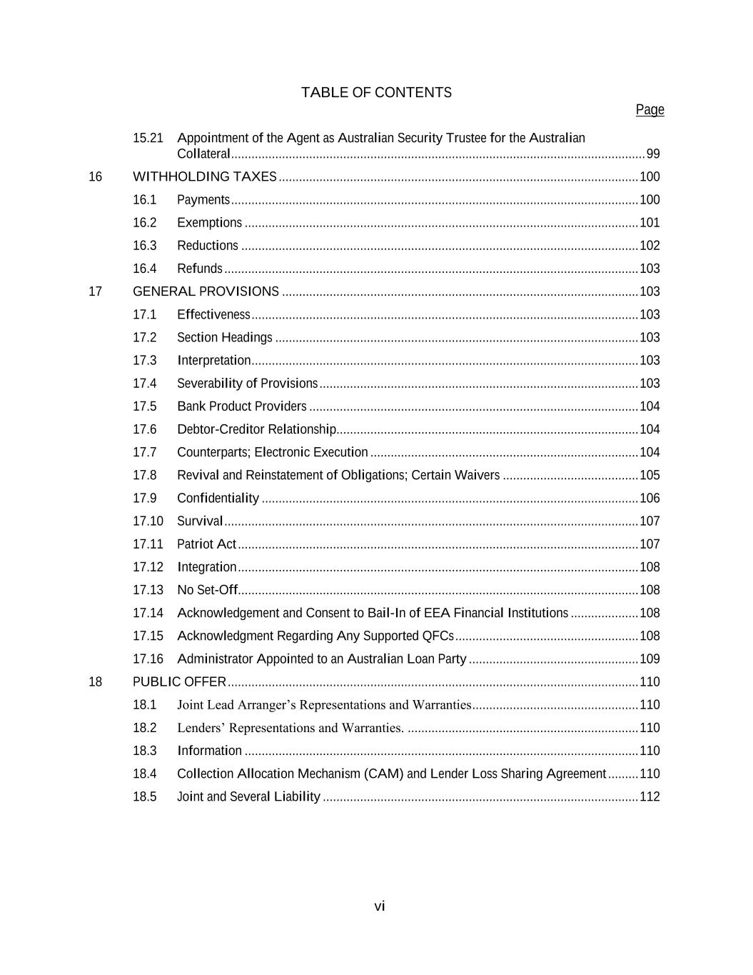 TABLE OF CONTENTS Page vi 15.21 Appointment of the Agent as Australian Security Trustee for the Australian Collateral .......................................................................................................................... 99 16 WITHHOLDING TAXES .......................................................................................................... 100 16.1 Payments ........................................................................................................................ 100 16.2 Exemptions .................................................................................................................... 101 16.3 Reductions ..................................................................................................................... 102 16.4 Refunds .......................................................................................................................... 103 17 GENERAL PROVISIONS ......................................................................................................... 103 17.1 Effectiveness .................................................................................................................. 103 17.2 Section Headings ........................................................................................................... 103 17.3 Interpretation .................................................................................................................. 103 17.4 Severability of Provisions .............................................................................................. 103 17.5 Bank Product Providers ................................................................................................. 104 17.6 Debtor-Creditor Relationship......................................................................................... 104 17.7 Counterparts; Electronic Execution ............................................................................... 104 17.8 Revival and Reinstatement of Obligations; Certain Waivers ........................................ 105 17.9 Confidentiality ............................................................................................................... 106 17.10 Survival .......................................................................................................................... 107 17.11 Patriot Act ...................................................................................................................... 107 17.12 Integration ...................................................................................................................... 108 17.13 No Set-Off...................................................................................................................... 108 17.14 Acknowledgement and Consent to Bail-In of EEA Financial Institutions .................... 108 17.15 Acknowledgment Regarding Any Supported QFCs ...................................................... 108 17.16 Administrator Appointed to an Australian Loan Party .................................................. 109 18 PUBLIC OFFER ......................................................................................................................... 110 18.1 Joint Lead Arranger’s Representations and Warranties ................................................. 110 18.2 Lenders’ Representations and Warranties. .................................................................... 110 18.3 Information .................................................................................................................... 110 18.4 Collection Allocation Mechanism (CAM) and Lender Loss Sharing Agreement ......... 110 18.5 Joint and Several Liability ............................................................................................. 112