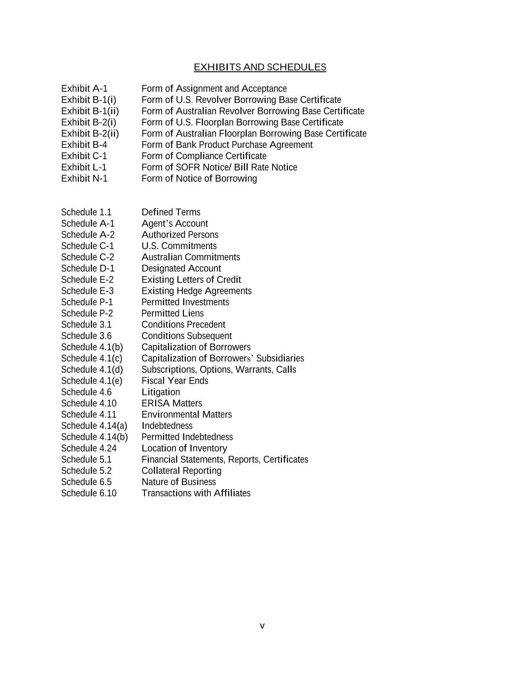 v EXHIBITS AND SCHEDULES Exhibit A-1 Form of Assignment and Acceptance Exhibit B-1(i) Form of U.S. Revolver Borrowing Base Certificate Exhibit B-1(ii) Form of Australian Revolver Borrowing Base Certificate Exhibit B-2(i) Form of U.S. Floorplan Borrowing Base Certificate Exhibit B-2(ii) Form of Australian Floorplan Borrowing Base Certificate Exhibit B-4 Form of Bank Product Purchase Agreement Exhibit C-1 Form of Compliance Certificate Exhibit L-1 Form of SOFR Notice/ Bill Rate Notice Exhibit N-1 Form of Notice of Borrowing Schedule 1.1 Defined Terms Schedule A-1 Agent’s Account Schedule A-2 Authorized Persons Schedule C-1 U.S. Commitments Schedule C-2 Australian Commitments Schedule D-1 Designated Account Schedule E-2 Existing Letters of Credit Schedule E-3 Existing Hedge Agreements Schedule P-1 Permitted Investments Schedule P-2 Permitted Liens Schedule 3.1 Conditions Precedent Schedule 3.6 Conditions Subsequent Schedule 4.1(b) Capitalization of Borrowers Schedule 4.1(c) Capitalization of Borrowers’ Subsidiaries Schedule 4.1(d) Subscriptions, Options, Warrants, Calls Schedule 4.1(e) Fiscal Year Ends Schedule 4.6 Litigation Schedule 4.10 ERISA Matters Schedule 4.11 Environmental Matters Schedule 4.14(a) Indebtedness Schedule 4.14(b) Permitted Indebtedness Schedule 4.24 Location of Inventory Schedule 5.1 Financial Statements, Reports, Certificates Schedule 5.2 Collateral Reporting Schedule 6.5 Nature of Business Schedule 6.10 Transactions with Affiliates